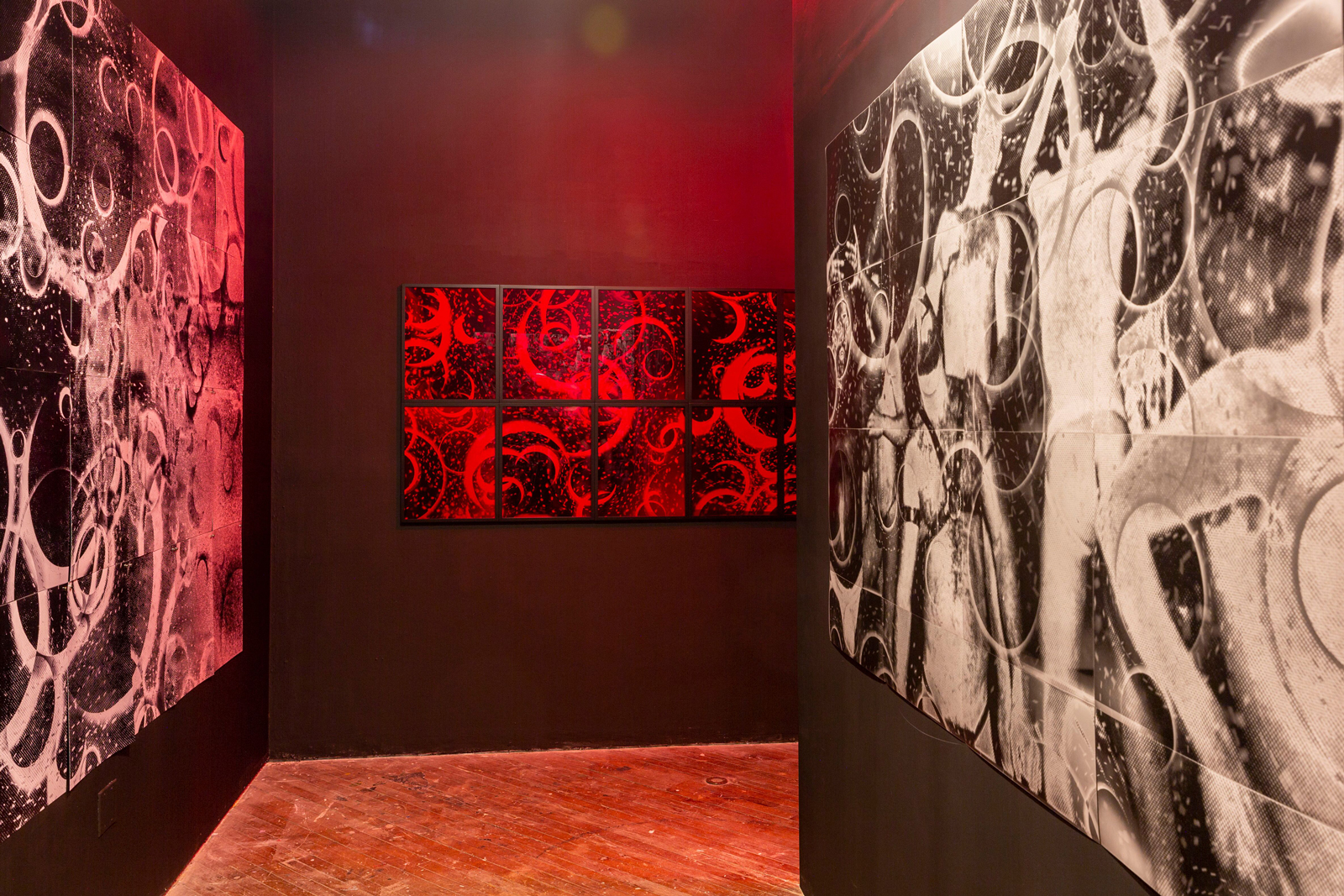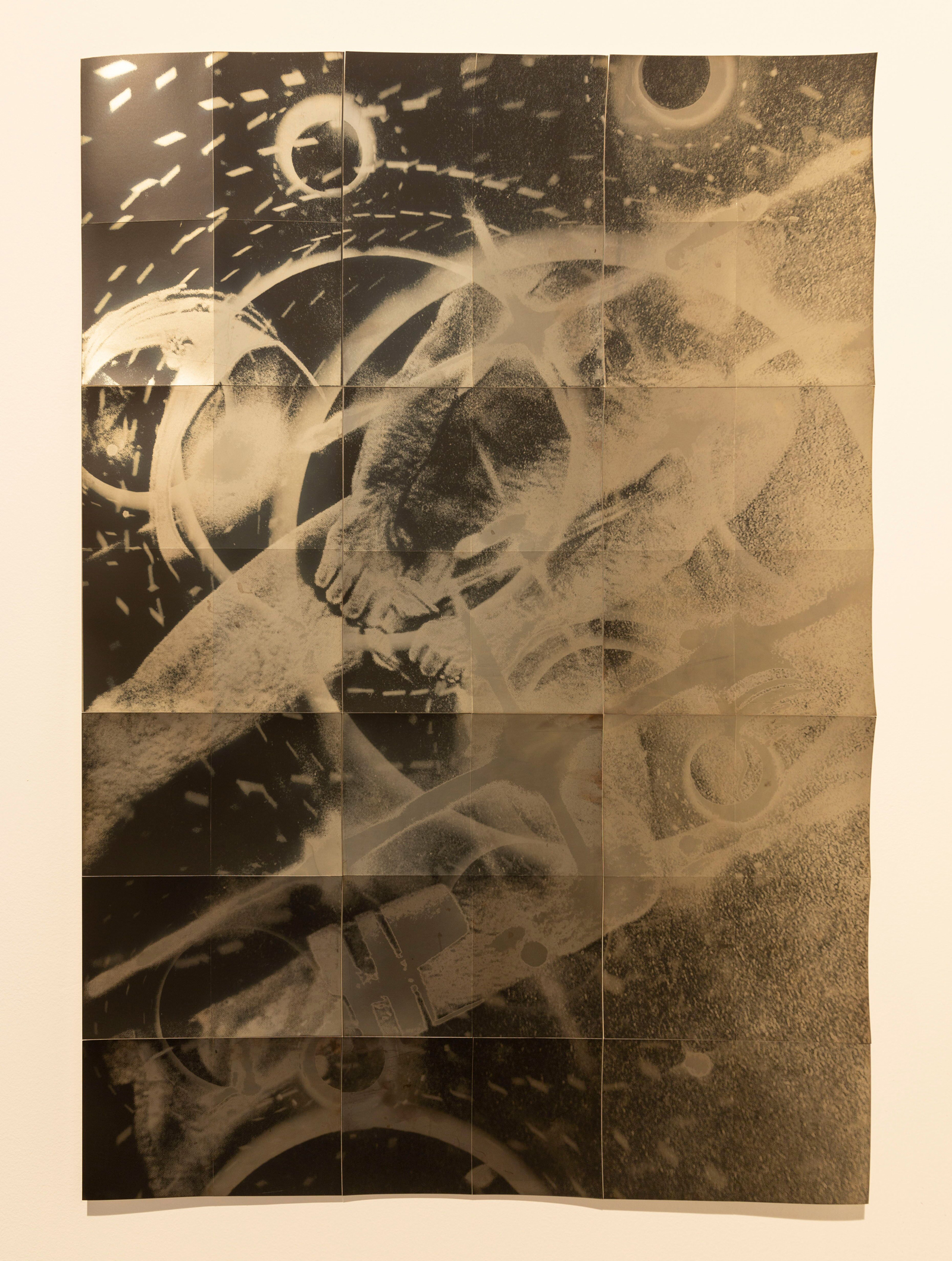 The mirror ball, a symbol of disco music, is a part of nearly every artwork in Bound to the Past.Martinez exposed his photograms to light reflected off of disco balls to create the eclipse effect and the transitory-like patterns that surround them. At times, these eclipses overlap to form fortuitous biohazard symbols that some folx associate with an HIV-positive status. The rampant sexuality prevalent in the disco scene and the genre’s decline in the 1980s stands as a poignant metaphor for the impact of the AIDS epidemic on the queer community. Devoid of figures and brimming with biohazard signs, “Bound to the Past (red night)” exists as a liminal space situated between these starkly contrasted periods of liberated sexuality and the stigmatization of gay sex.