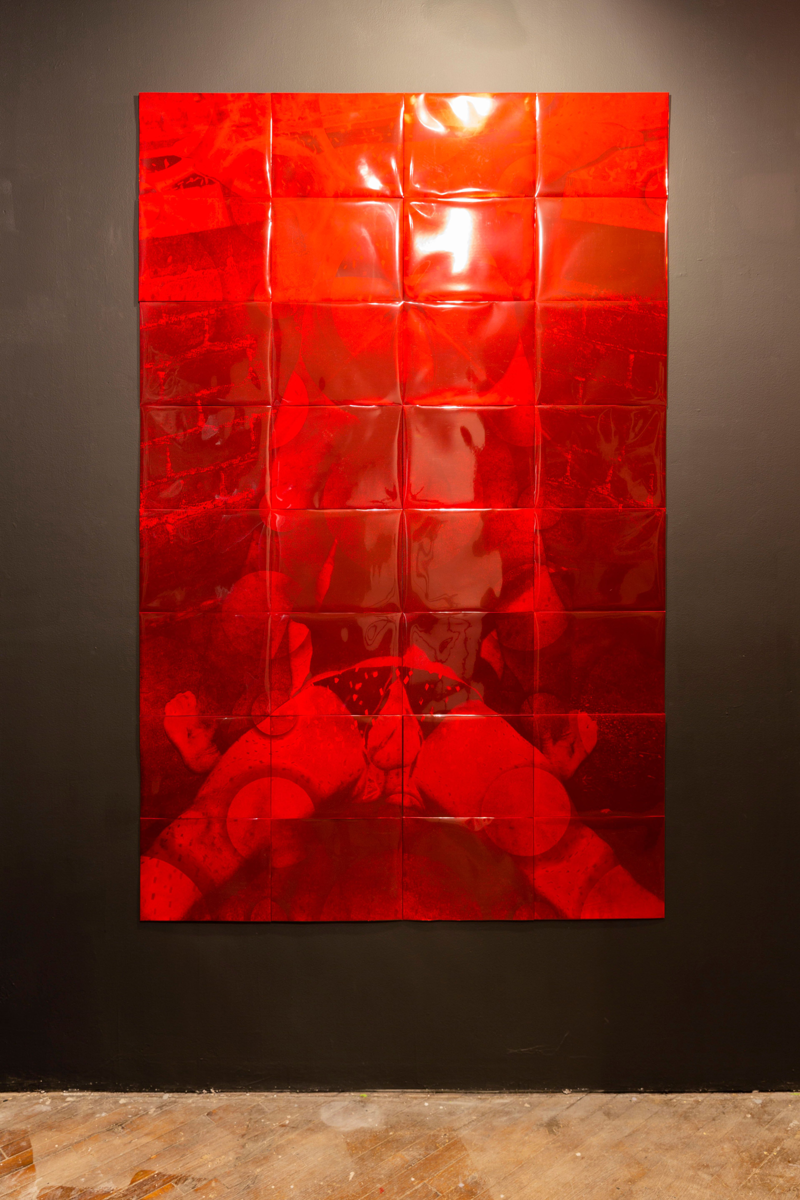 Martinez manipulated most of these photographs with solarization, a technique that overexposes and distorts the original image. The lasting effect is a menagerie of abstract forms and textures from half-tone advertisements and other archival materials that were blown up in scale, printed in fragments, and joined together to form quilt-like tapestries that reveal varying degrees of clarity. The artist employed silver gelatin prints for some of his compositions to provide an atmospheric, nostalgic glow. In others, he layered red mylar atop the photographs, adding a magazine-like sheen to them that calls to mind a porngraphic centerfold or eroticized advertisement from where the imagery was sourced.