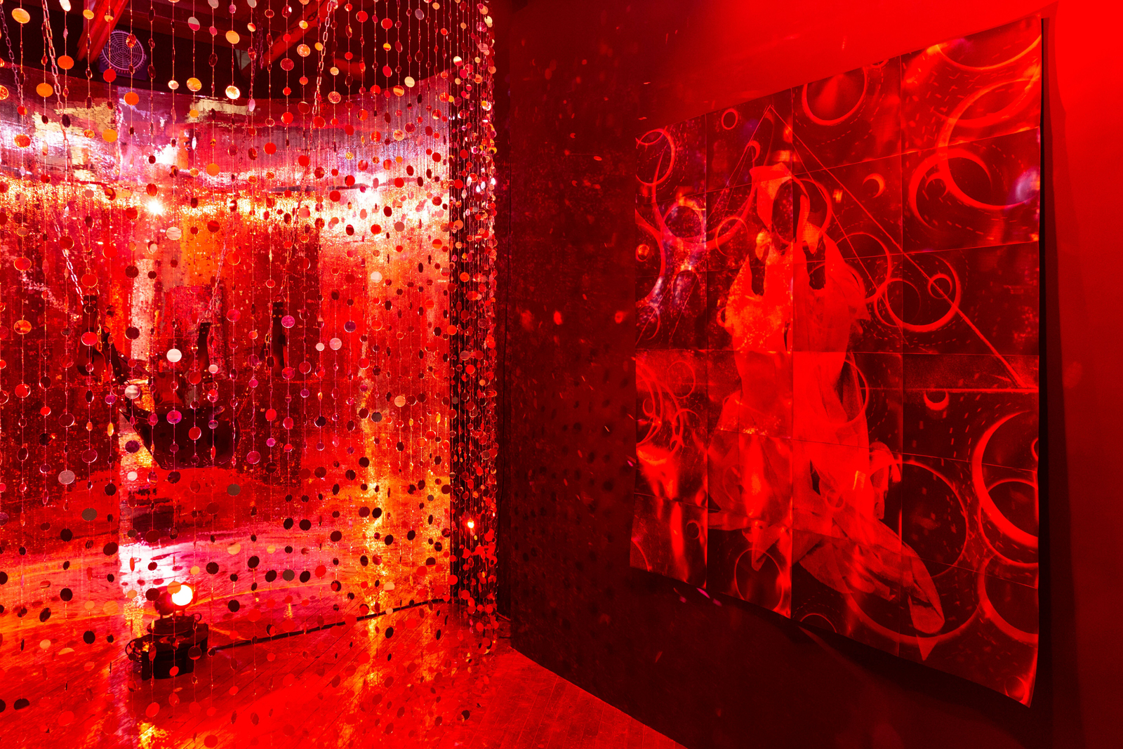 Bound to the Past culminates with the red-lit backroom where “Queer Eclipse (wizard)” hangs. This Virgin-like figure dressed in flowing robes floats among celestial forms and serves as an intercessor between the past and future generations. The wizard simultaneously invokes the sexual energy of the pre-AIDS era and reminds viewers of the toll that the epidemic took on the queer community. By looking to the past, Martinez encourages a stigma-free future where sexuality is expressed freely and practiced safely.