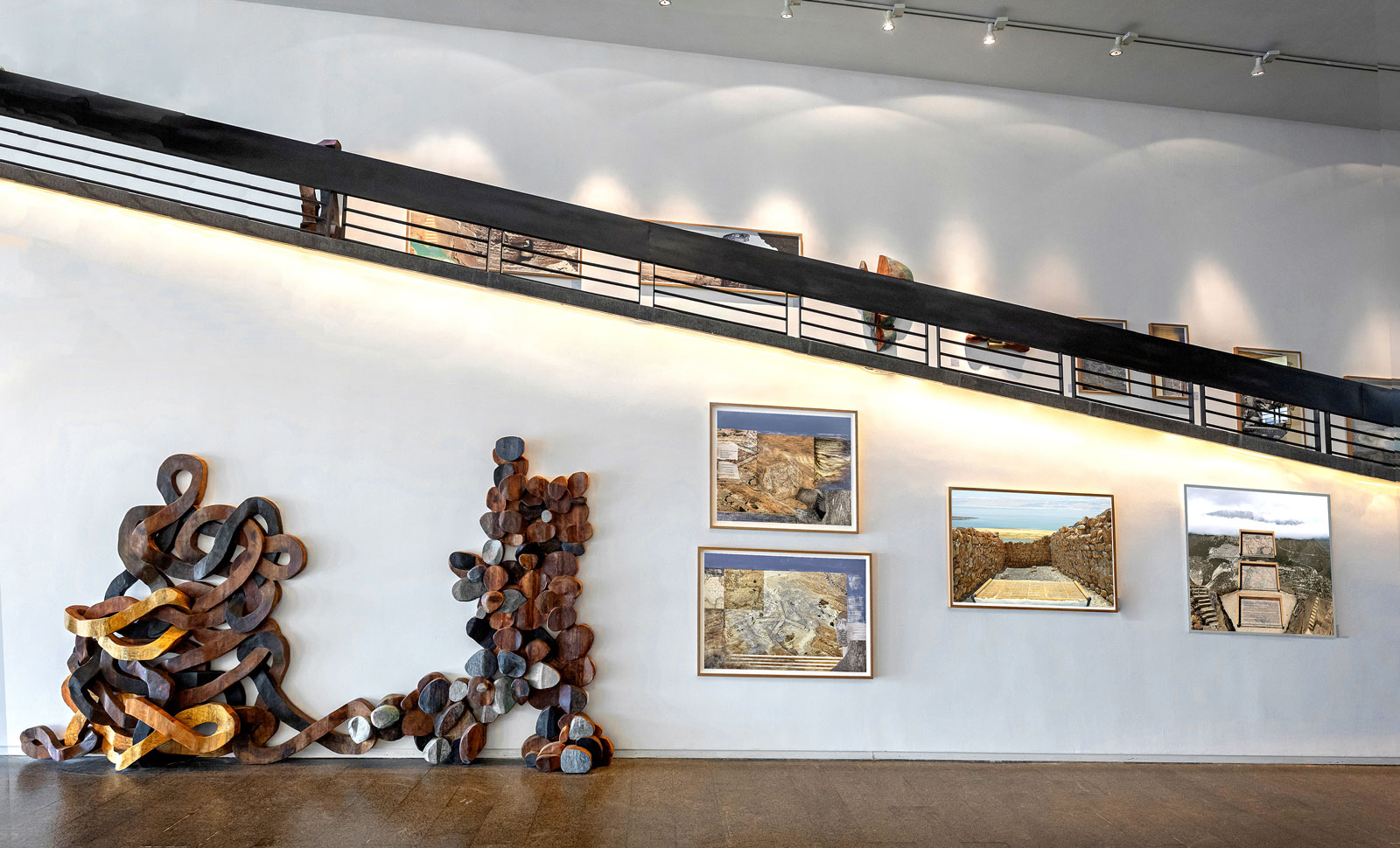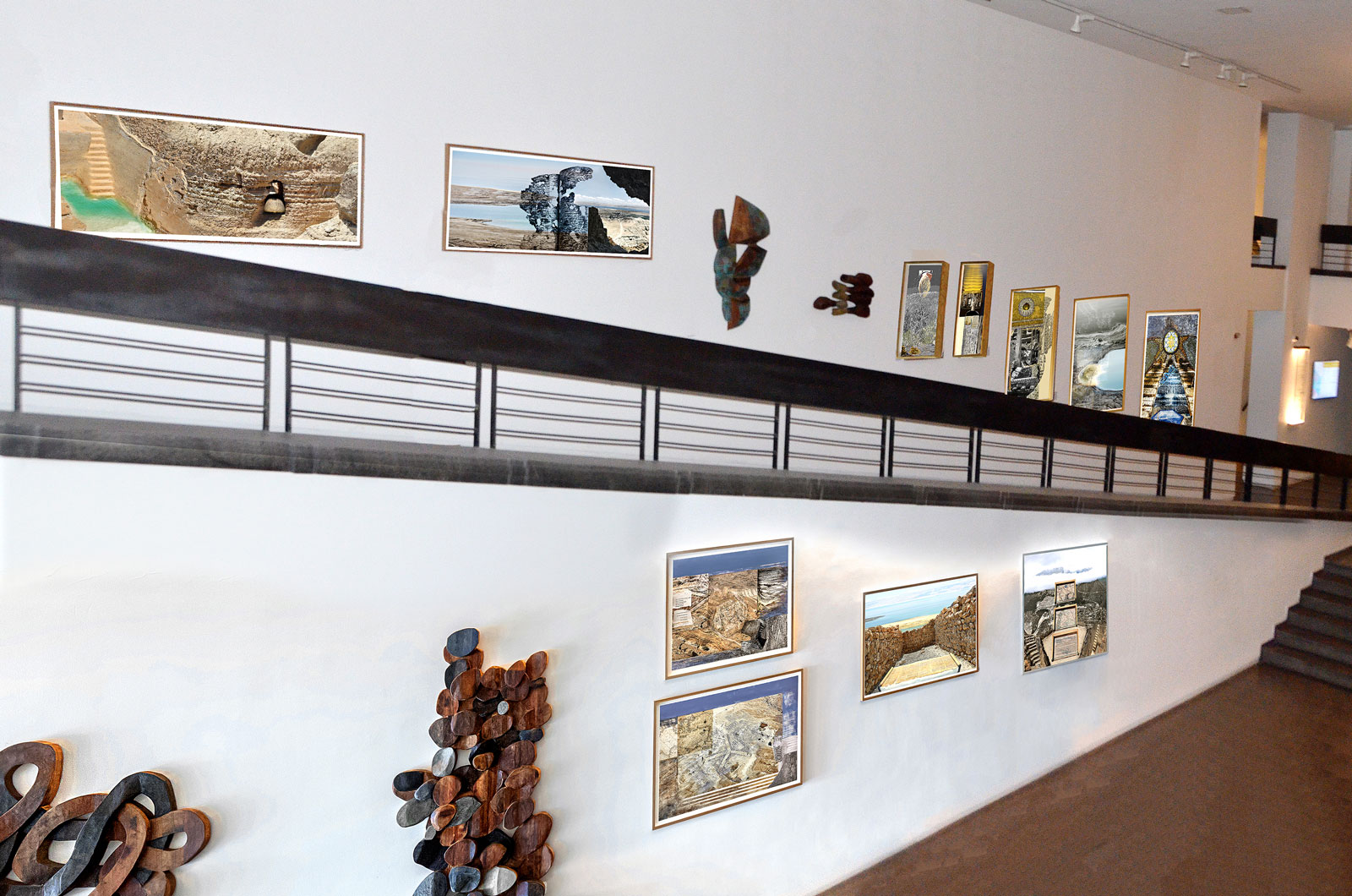 The other exhibition, “Transcendence: Dorit Feldman and Rachel Rotenberg,” which I curated, addresses how two artists, with very different mediums, styles, and conceptual premises explore our spiritual existence today. Feldman, an artist scholar, looks outward, utilizing her own photographs and historical maps to create multi-media works while Rotenberg looks inward, creating within an intuitive framework, emphasizing materials and process in her sculpture.