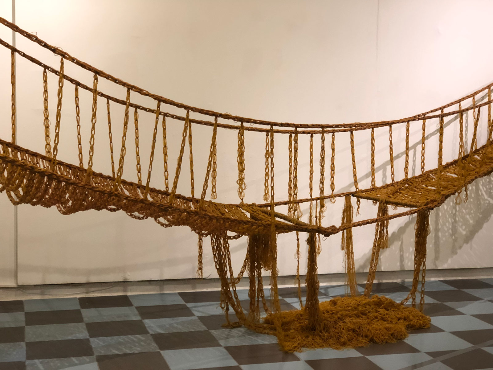 Including several suns is Latvian artist Daiga Grantina’s “Saules Suns.” A whimsical installation comprised of less permanent materials, various forms sprawl across a less polished gallery space. The curators describe the work as a “playground for the eye.” Certainly, the prosaic materials—metal, wood, cotton, flax, thread, paper, flax fiber, and plastics—contrast with some of the more monumental installations and reflect a humbler way of seeing the world. Ghana, with its first contribution to the Biennale, also involves artists using humble materials, the most well-known being El Anatsui, who creates large curtains with things like discarded aluminum cans. His work here does not disappoint.