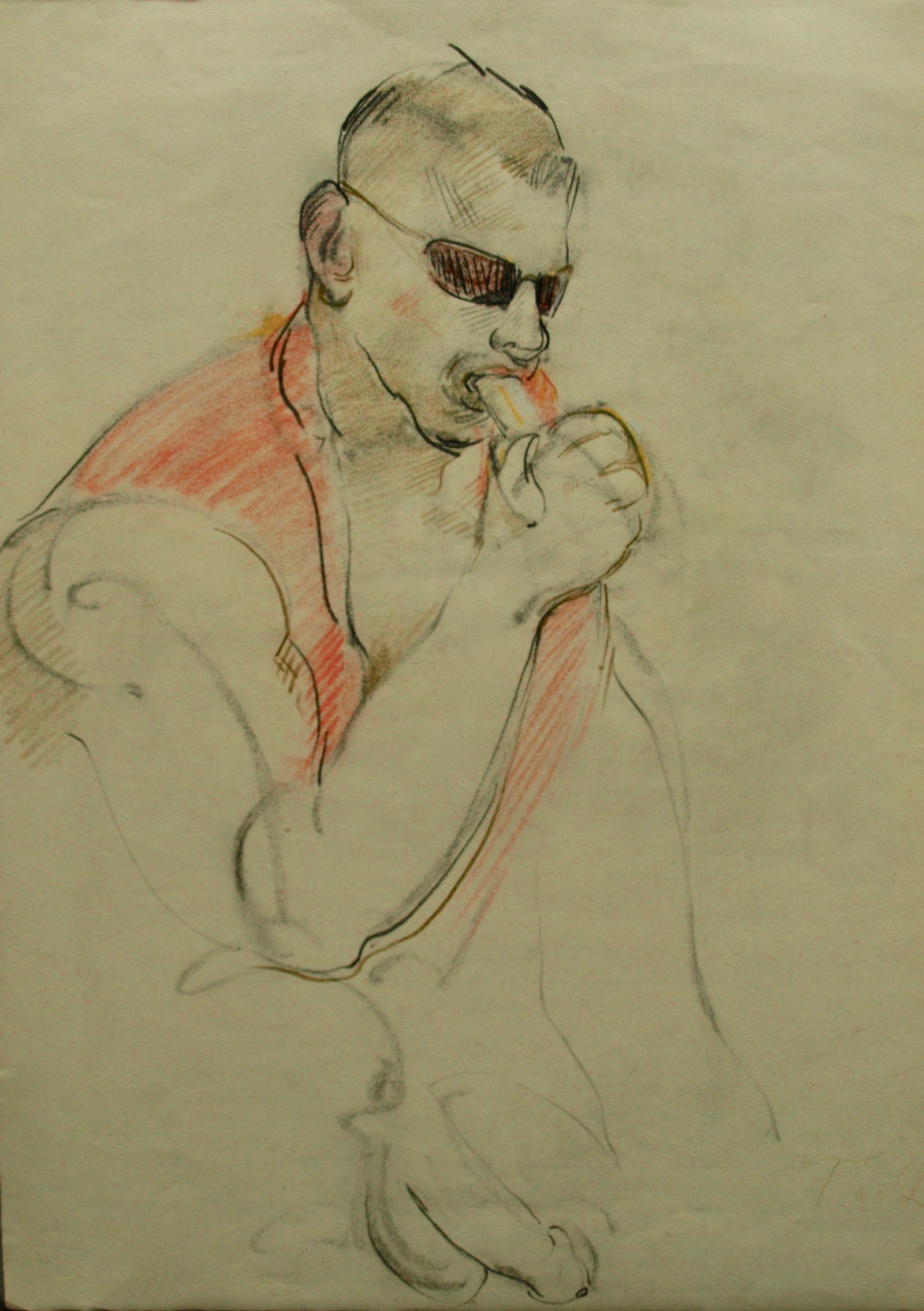 That open, erotically charged atmosphere undoubtedly accounts for the playfulness and the sexual frisson present in many of the drawings, including “Bananas!” It depicts a buff, short-haired man in semi-profile. He’s nude, except for a pair of sunglasses and what looks like a sleeveless work shirt. He also appears to be engrossed in eating a banana, which is amusing, given his butch demeanor and the fact that he is, basically, naked. A splash of color on the model’s shirt and sunglasses guides viewers upwards, towards his mouth. Lower your glance to the bottom center of the drawing, however, and you can’t help but notice that the banana is much smaller than the model’s cock. Is it exaggerated? Perhaps. As Simcoe wrote in notes accompanying the exhibit, “Even though the genitals were much lower in real life, I placed them where they might have been connected to an optimal dream.”