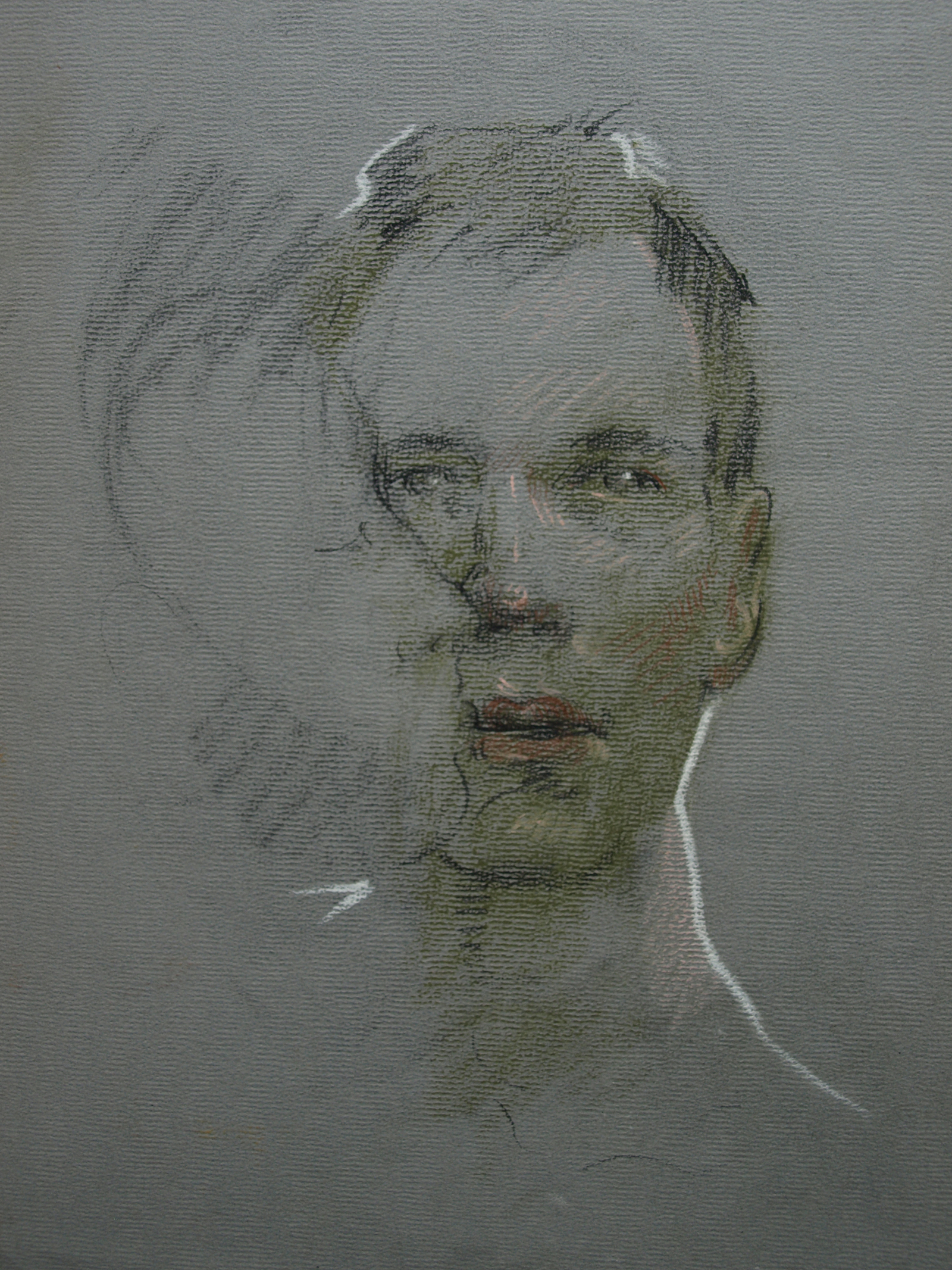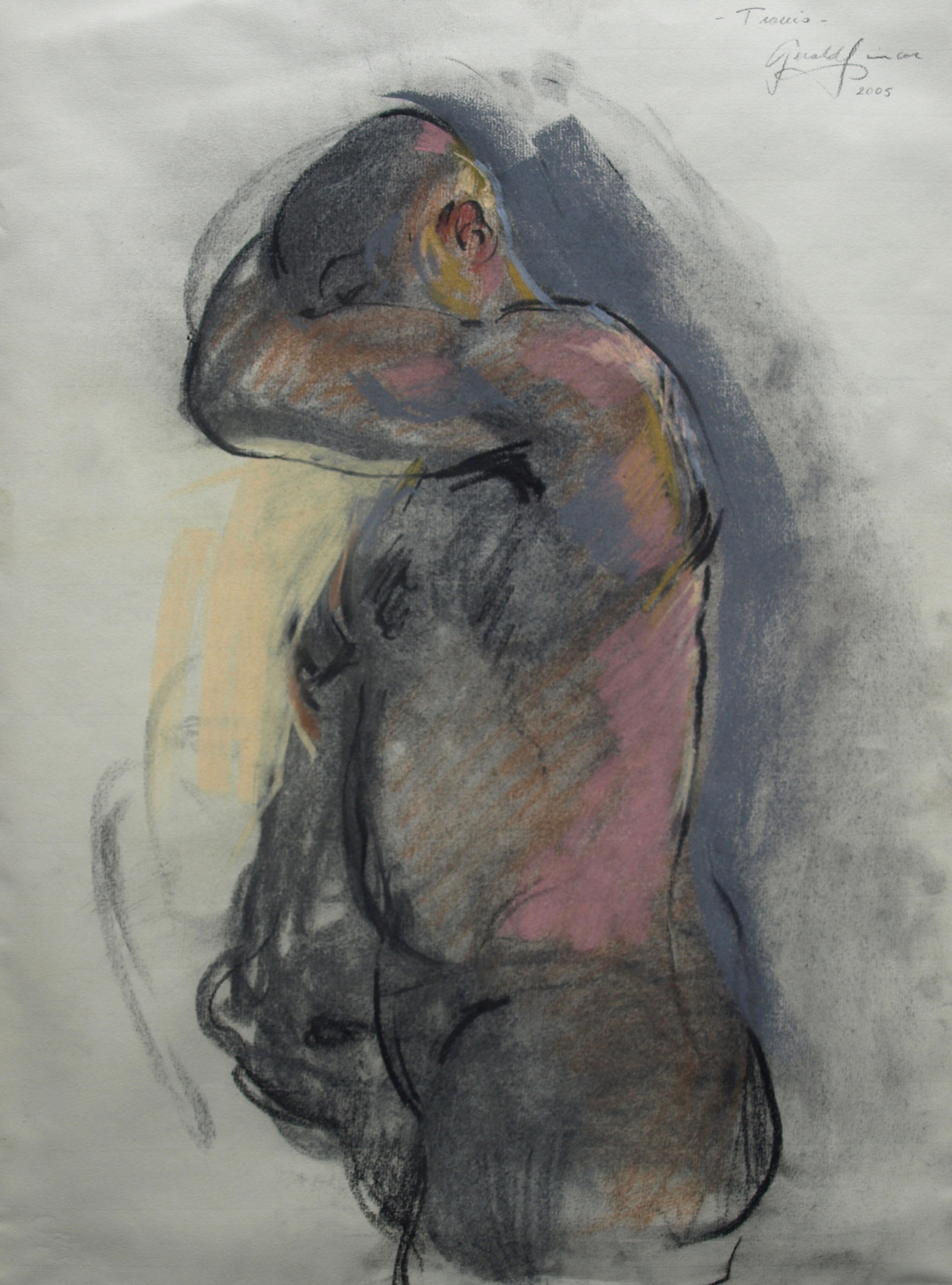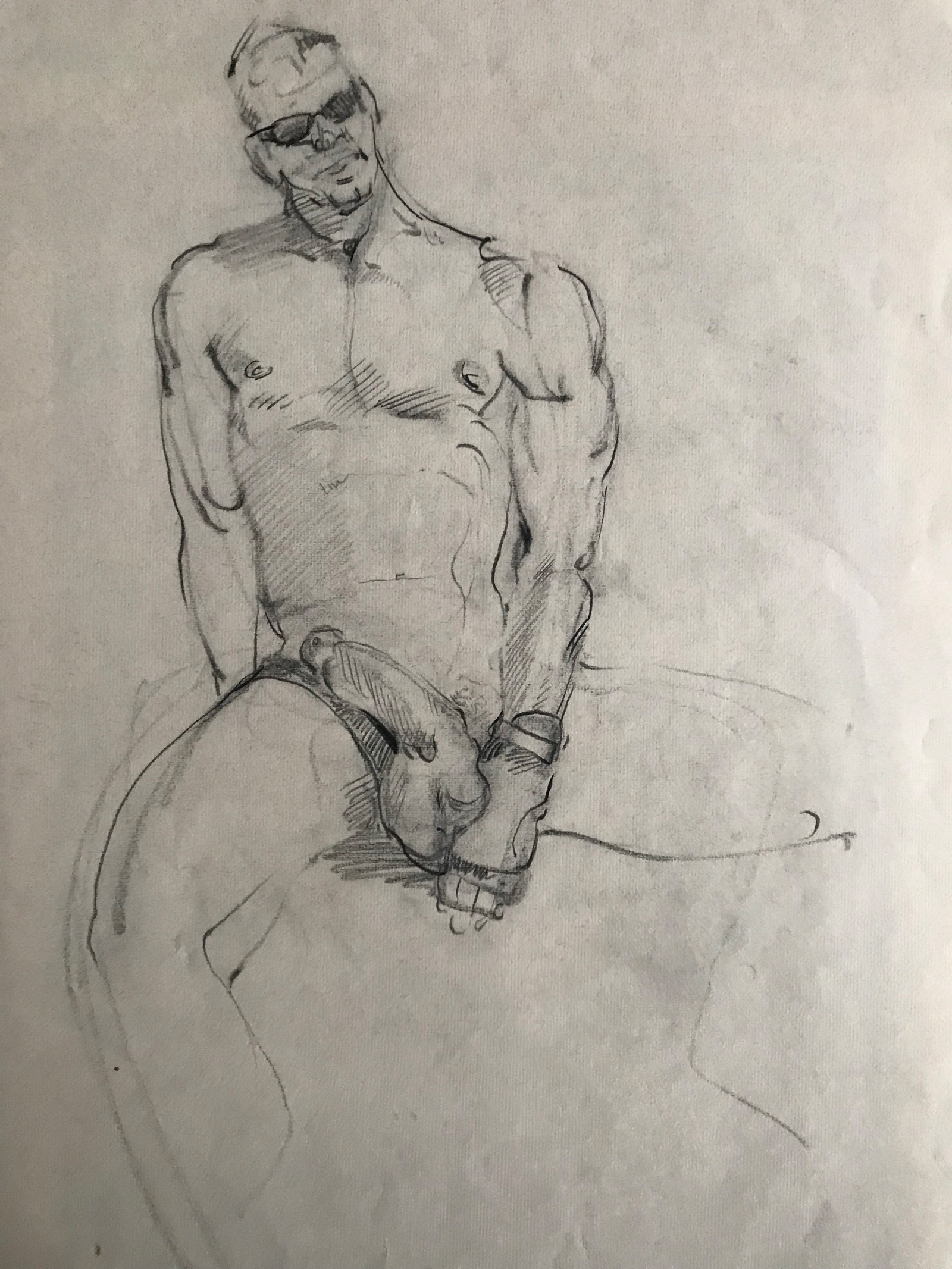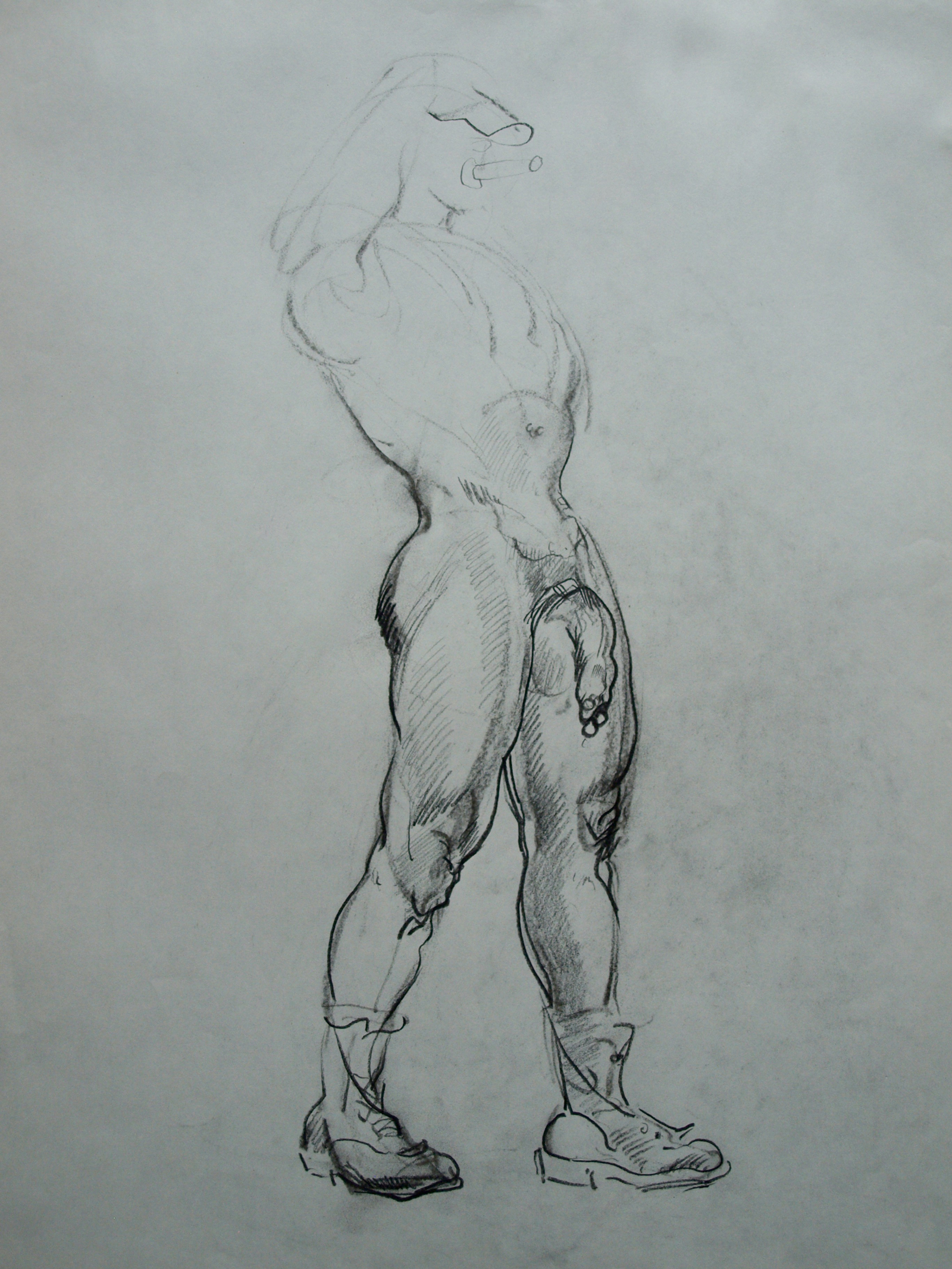 Perhaps the drawing that best exemplifies the exhibit is “Trevor Fapping.” In it, a muscular, handsome man of color is shown intently stroking himself. His left arm, which partly obscures his face, appears to be braced against a support of some sort, while his right arm pumps vigorously. Shadows along the model’s back emphasize the curve of his muscles, while smudging around his cock conveys the motion.