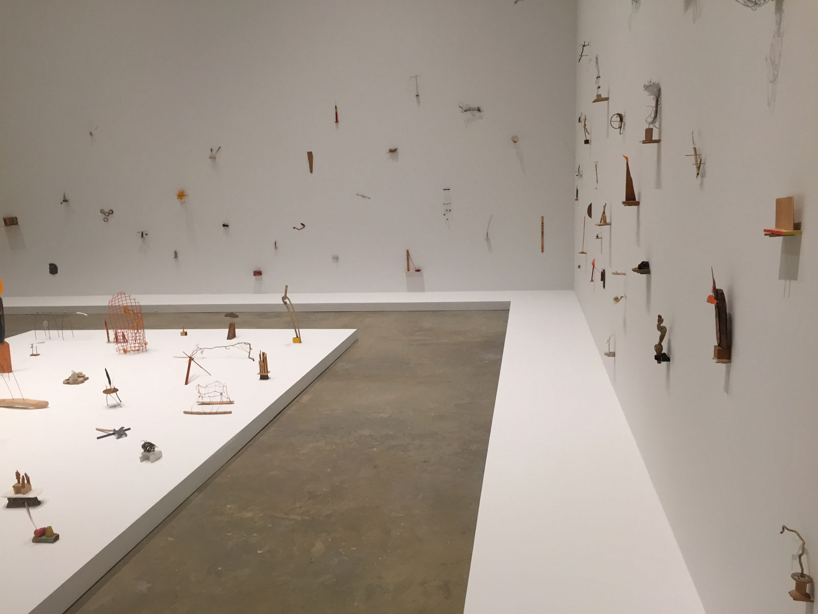 Each precario moment is composed of three or four pieces of detritus, combined through Cecilia Vicuña’s attention, to create a fragile little group identity, loosely joined into a totem. A few little weathered triangles of plywood, some edges of weathered paint, begin to look like a family of ducks. A small piece of driftwood with three thin spines rising out of it, one supporting a spiral of bent wire, the other two supporting more fragments of twine or wood, has the air of a tiny runic fishing vessel. These float in the white space of the plinth amid a sea of islands of other little totems, each one an improbable contrast of color and material. A little shard of joy, of faith. The show has been accumulating since 1977, has been growing up to the present. It represents not only a project but carries with it the weight and depth of long practice.