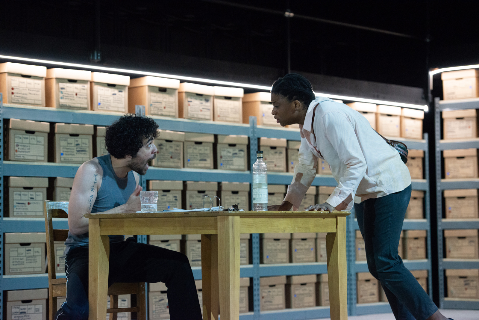 Consequently, Joseph’s play about the unstable relationship between fact and fiction in Russia under Stalin and Putin was alarmingly legible. The first scene sets up the dialectic of Describe the Night—a civilian has died and two men, a writer and a soldier, circle around putting the event into words. At first, the writer’s imagination soars while the soldier’s descriptions remain thuddingly literal. The writer invents freely, for metaphysical purposes, but the soldier only gets inspired when it dawns on him that invention can serve political purposes, too. The soldier tells a story of the civilian’s death that omits much and changes certain key details, leaving the soldier looking like a victim where he might have come out looking like the villain.