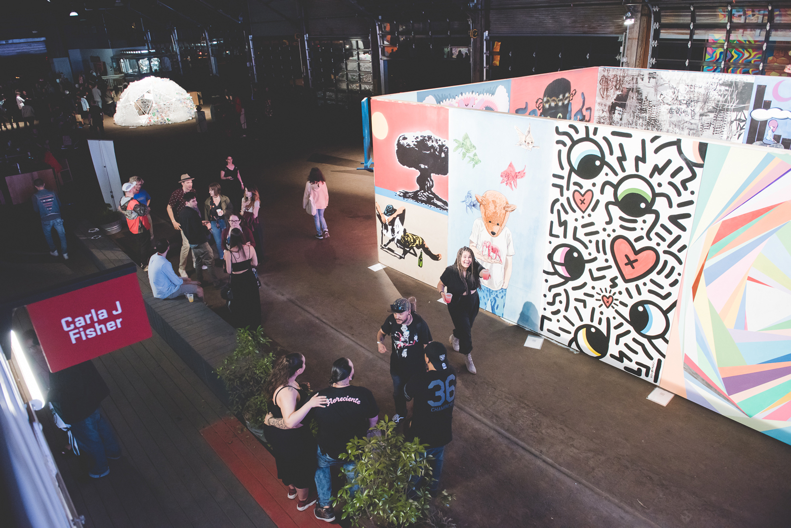 TRFEF19 was held at Cherry Street Pier, April 19-21, 2019, receiving 13,000 visitors. The team led by Yaya Horne and Dame Ward built a 38 panel gallery space and artists completed 10’x6’ or 10’x12’ panels or did installations, with a festival line up of 20 musicians and DJs. There were many sponsors, donated services and supplies — Champion never looked so good as when Yaya and Dame rocked it. Bringing all of these moving parts together, underpinned by a strong network of dedicated artists, musicians and designers, made it a truly immersive cultural experience.