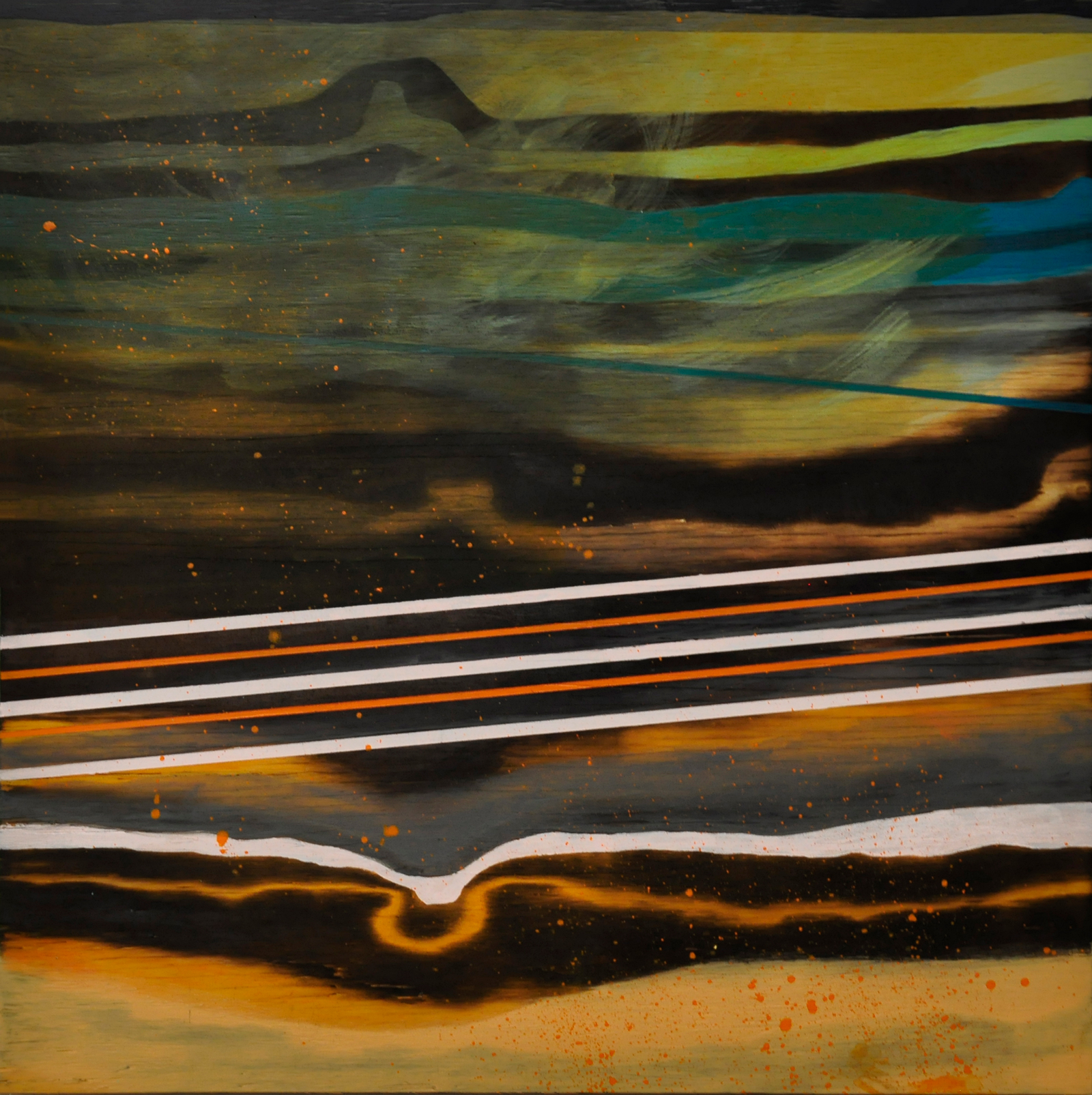 Kishita’s exhibit, Absent Futures, at the Central Tattoo Studio and Gallery, includes eight of these paintings. Each of them is dreamy, vast, and uses the undulations of the burnt wood panels to depict bold, rich landscapes and skyscapes. Moreover, they each incorporate an abstract form of human-made movement, or line. Yet these potentially disparate elements flow together and are connected with surprising harmony in most of the paintings — exemplified here in “Another Dawn” and “When There Was Ice” — abetted by the artist’s absolutely unique use of color. In both of these paintings, for instance, earth tones are offset against tinges of green, orange, or even copper, which glow and seem almost unnatural.