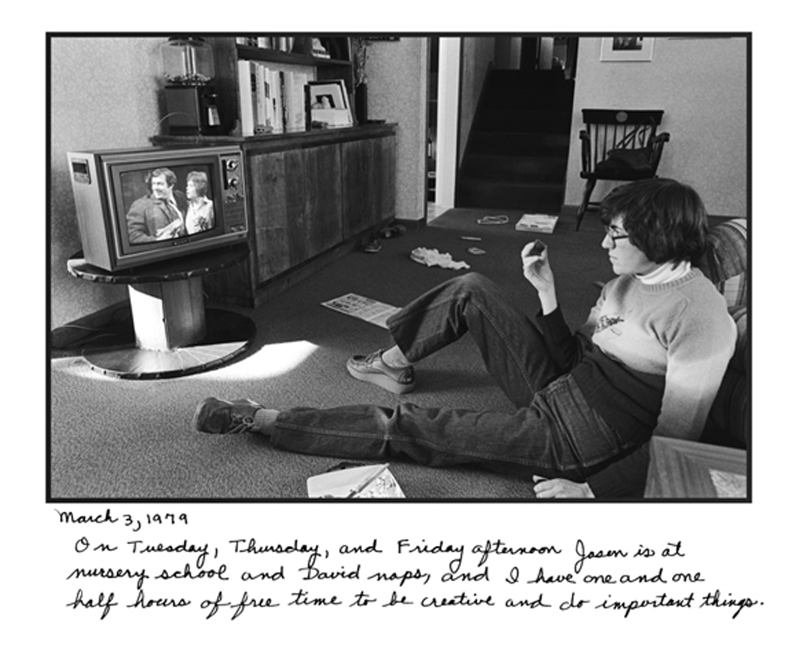 Exploration of these social aspects of life, often viewed through the lens of her personal relationships and experiences, would form a major focus of her artistic practice for decades, beginning with her first sustained artistic project “Family Portraits 1977-82.” Though these works initially appear to be a series of snapshots, through these carefully-constructed images, enhanced by hand-written texts purporting to reveal the artist’s inner thoughts, she represents the messy realities of her daily life as a wife and mother of small children at home. In this highly-original series, Judy deconstructs the idealized view of the role of wife and mother promulgated in the fifties. A favorite image from this series is the one illustrated here: “Self-Portrait Watching TV” (1979), which shows Judy, in the midst of household debris, eating and zoned out in front of a soap opera on TV. With characteristic honest self-scrutiny and sense of irony, she reveals, through the caption she appends, that her domestic duties leave her one-and-a half hours, three times a week “to do something creative and important.” Like so much of her work, its basis is her personal experience conveyed with candor and humor, but it also raises a larger issue–the difficulties that so many women have faced in balancing professional aspirations with domestic responsibilities.