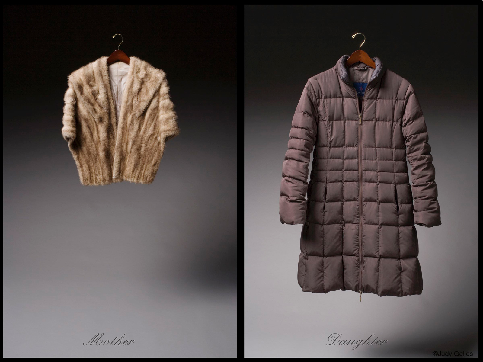 Judy explored these issues in several series, focusing on her family as a kind of social microcosm. In her series “Family Ties: Three Generations,” she presented images of pairs of similar types of commonplace objects, each belonging to one of three generations of Judy’s family. These simple “family artifacts” provide social commentary relating to gender difference, continuity and change between generations, and cultural values. “Mother Son,” pairs photos of her, and ones of her older son Jason, each from age six, to age eighteen. The triptych form, with interwoven text between the images, explores their widely different experiences and self-images at each age, revealing (in Judy’s words) “the subtly significant and significantly subtle ways we are taught to be male and female in our culture.” Another rich project is the “Florida Family Portraits 1982-2014.” In each image, Judy’s parents, husband, and children are shown in typical family portrait poses, behind Judy’s parents trailer home. These group portraits, taken each year during the family’s visits to see her parents, became a “Family tradition,” documenting the evolution of Judy’s family over many years, but they are much more than that. Like Nicolas Nixon’s series of “The Brown Sisters,” Judy’s work not only reveals the inevitable impact of the passage of the years, as each family member changes over time, but also the growth, and maturing, of children, the aging of parents and grandparents, and the pain of loss, experiences common to so many of us.