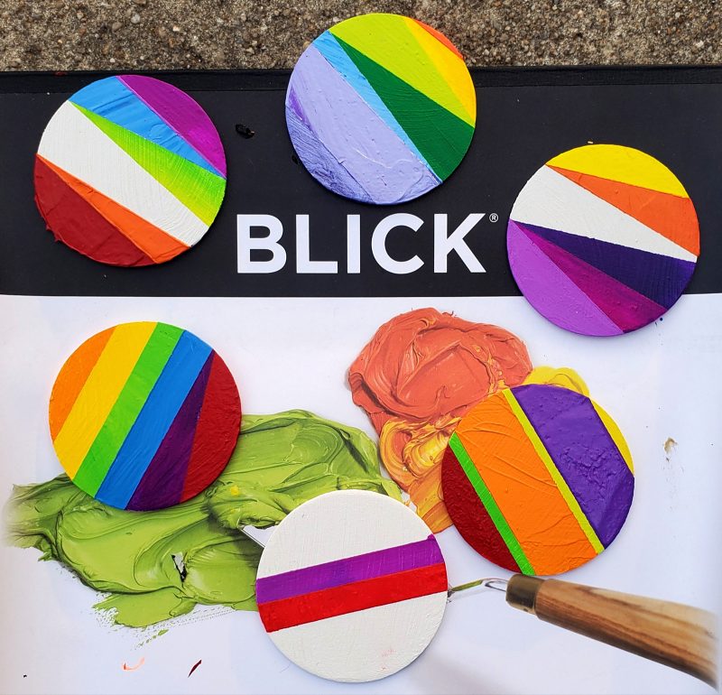 A few days ago I was inspired to do something totally different creatively. While walking down my street I was thinking of all the young kids who were being kept inside and I had an emotional reaction to all the rainbows I saw; taped to the inside of house windows, drawn in pastel chalk on sidewalks. I really wanted to do something for the kids that might make them a little happier. I remembered I had many small circular pieces of wood that I’d previously bought but never used, and the idea came to me of painting rainbows on them, turning them into magnets and leaving them at the houses where the kids lived. I remembered seeing somewhere online pictures of colorfully painted rocks, so I started painting rocks and a brick as well.