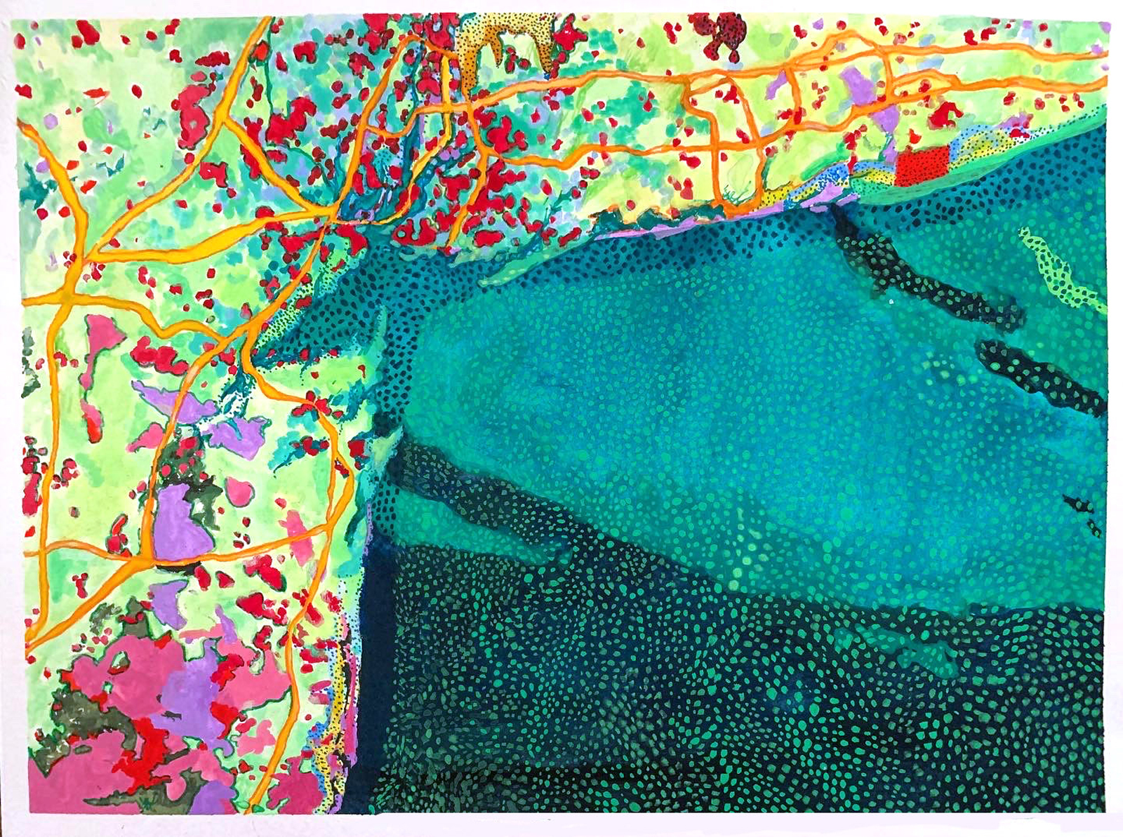 At this time, I am exploring contemporary cartography. This is an ongoing project from which I have found many points of connection to culture and societal conditions. Maps are a way of democratizing data. We no longer map just geographic location, but we are mapping businesses, societal changes, and as of recent- mapping the coronavirus in its progression across the globe. While being physically isolated, mapping allows connection- and the accessibility of mapping on digital platforms will only become more prevalent. I see endless potential in creative adaptations of digital mapping, and hope it helps us consider what it means to be connected.