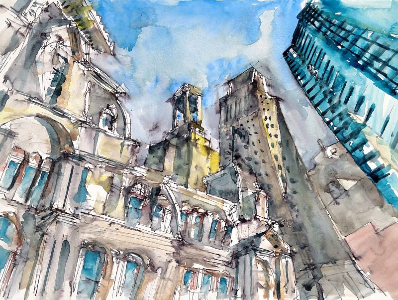 I have always been fascinated by the city, it’s scale, and qualities of light and shadow. From my days as a City Hall foot courier in Philadelphia to my present job as an architect, I have always found myself at the intersections, no pun intended, of art and city life, and the potential and kinetic energy. Conditions permitting (and sometimes not so much), I draw and paint on site, to capture the energy and character of spaces in the moment. When I can’t indulge myself with sitting at an intersection or plaza and painting, I try to find similar qualities in everyday items, continuing my practice into a routine I call Still Life Night Life. This entails starting a painting after 10pm, and finishing it the same night. Those moments are like a laboratory, studying the medium of watercolor, failing and learning to improve the more performative live painting and drawing practice on the streets of Philadelphia. Watercolor is the perfect medium for these practices. Although a bit unforgiving, it can do a lot of work FOR you, creating happy accidents to be left alone, or a drop of color that presents a perfect representation of shadow, or the transparency of glass, or space.