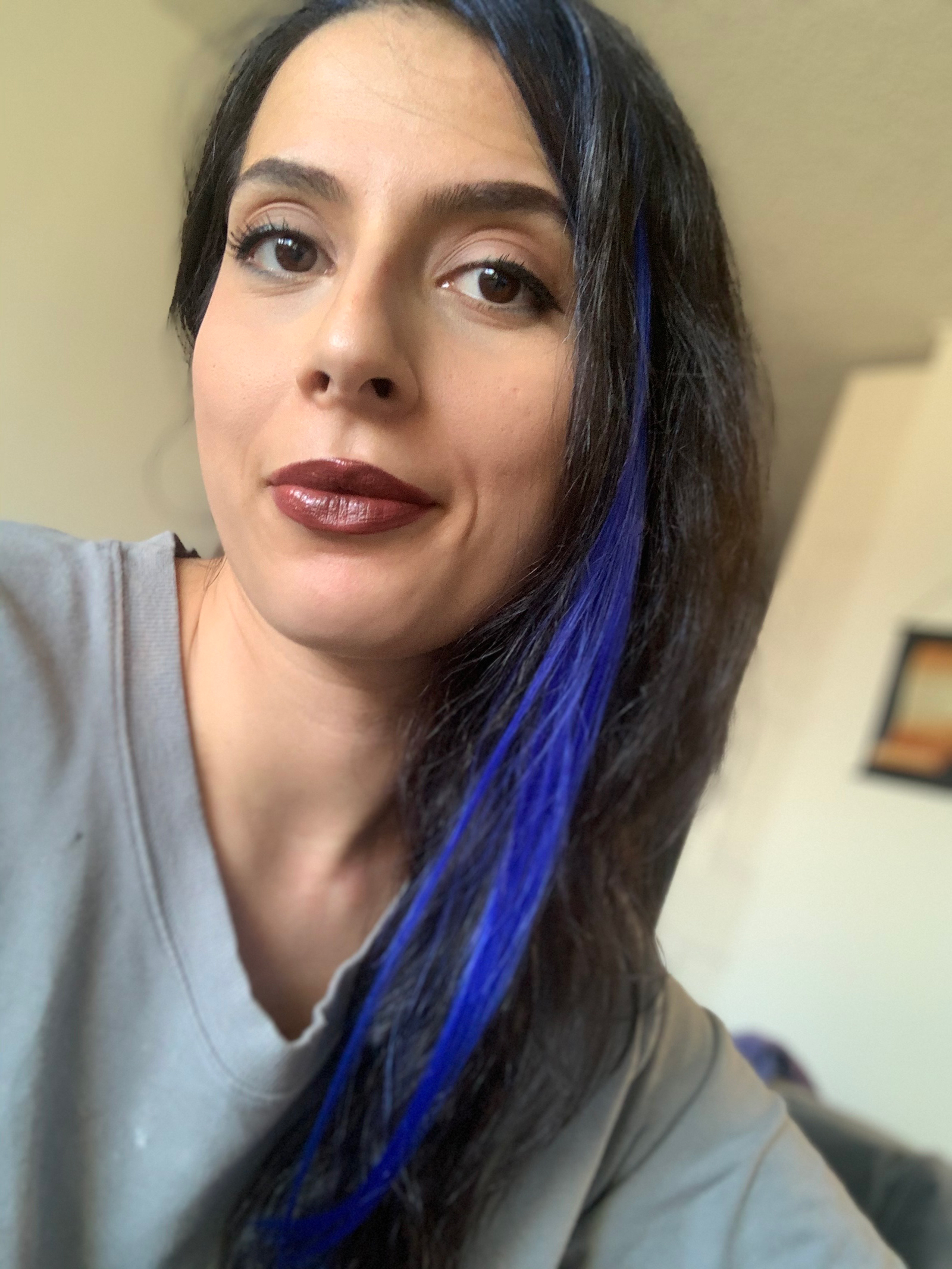I live alone and this time has been isolating but also beneficial. Instead of the news, I am focusing on my art. Here is a piece and selfie from today. Relax — I won’t wear the blue hair extension to work, it was just for fun! Wish me luck. ♥️