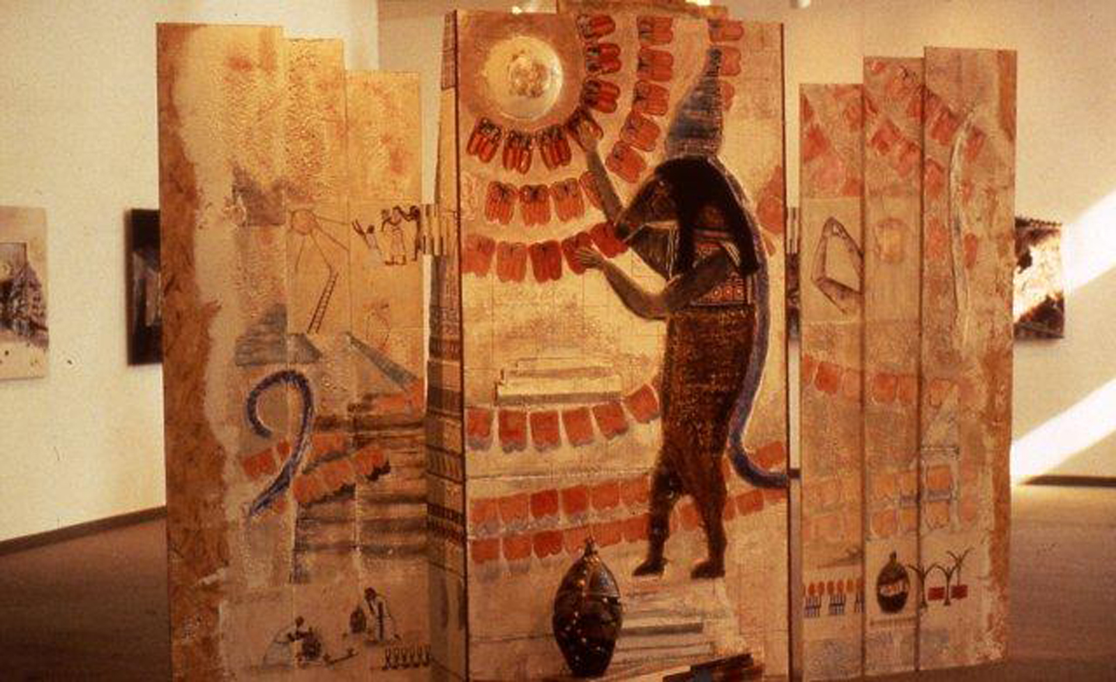The body of work is about science fiction of the past. It is my interpretation of what it might have been like to be a dentist in ancient Egypt. This work was done from 1989 to 1995. However, when Temple U. decided to utilize it in their new building I was honored and reinvigorated. So I proceeded to make a few new pieces as well.OCEANIC ORIGINS is one of those pieces and it speaks to the theory that teeth emerged from the skin or Dermal Plate as scientists call it. This just knocked me out. So I had to create some new work to go back thousands of years from life on the Euphrates river, 3000 BC.