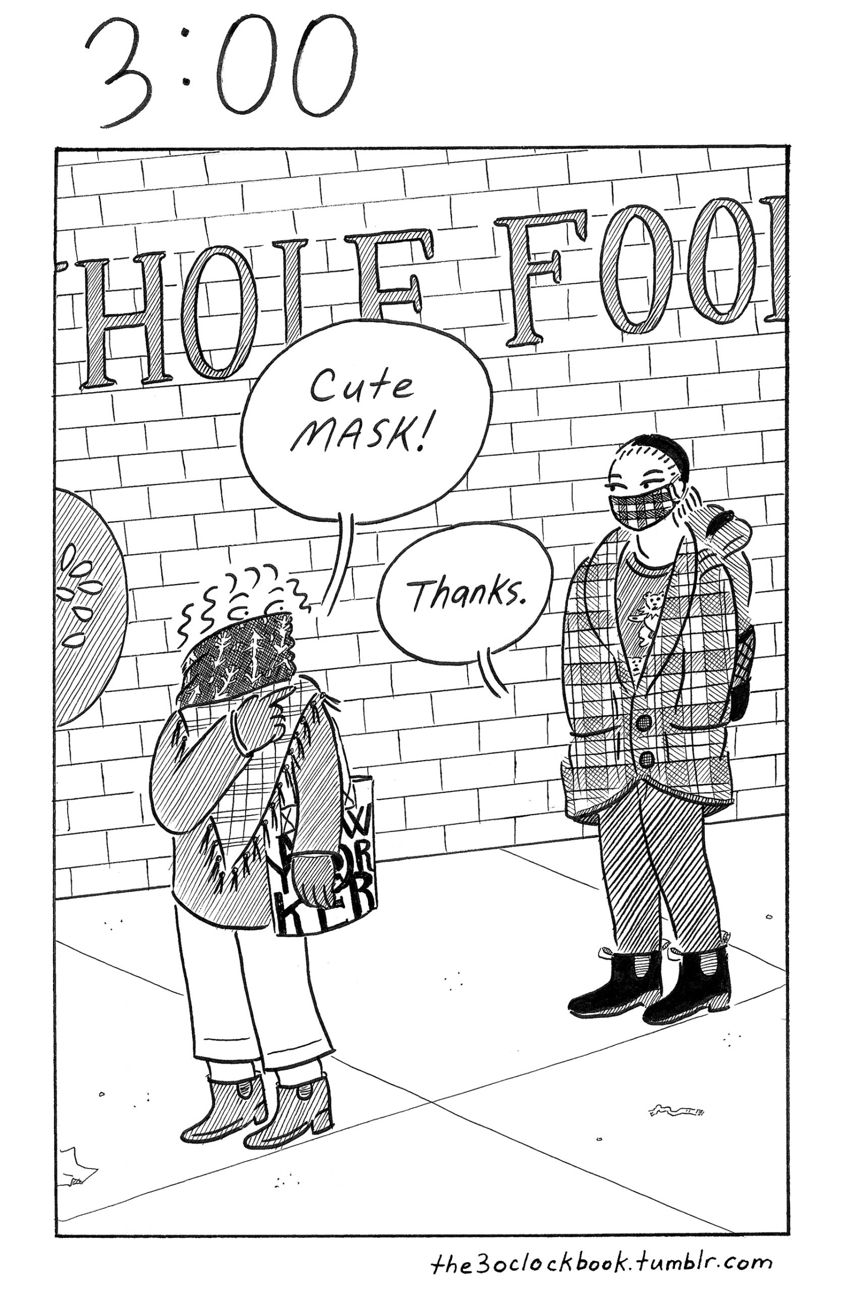 Transcription Two women wearing masks wait in line outside a grocery store. Woman 1: “Cute mask!” Woman 2: “Thanks.”