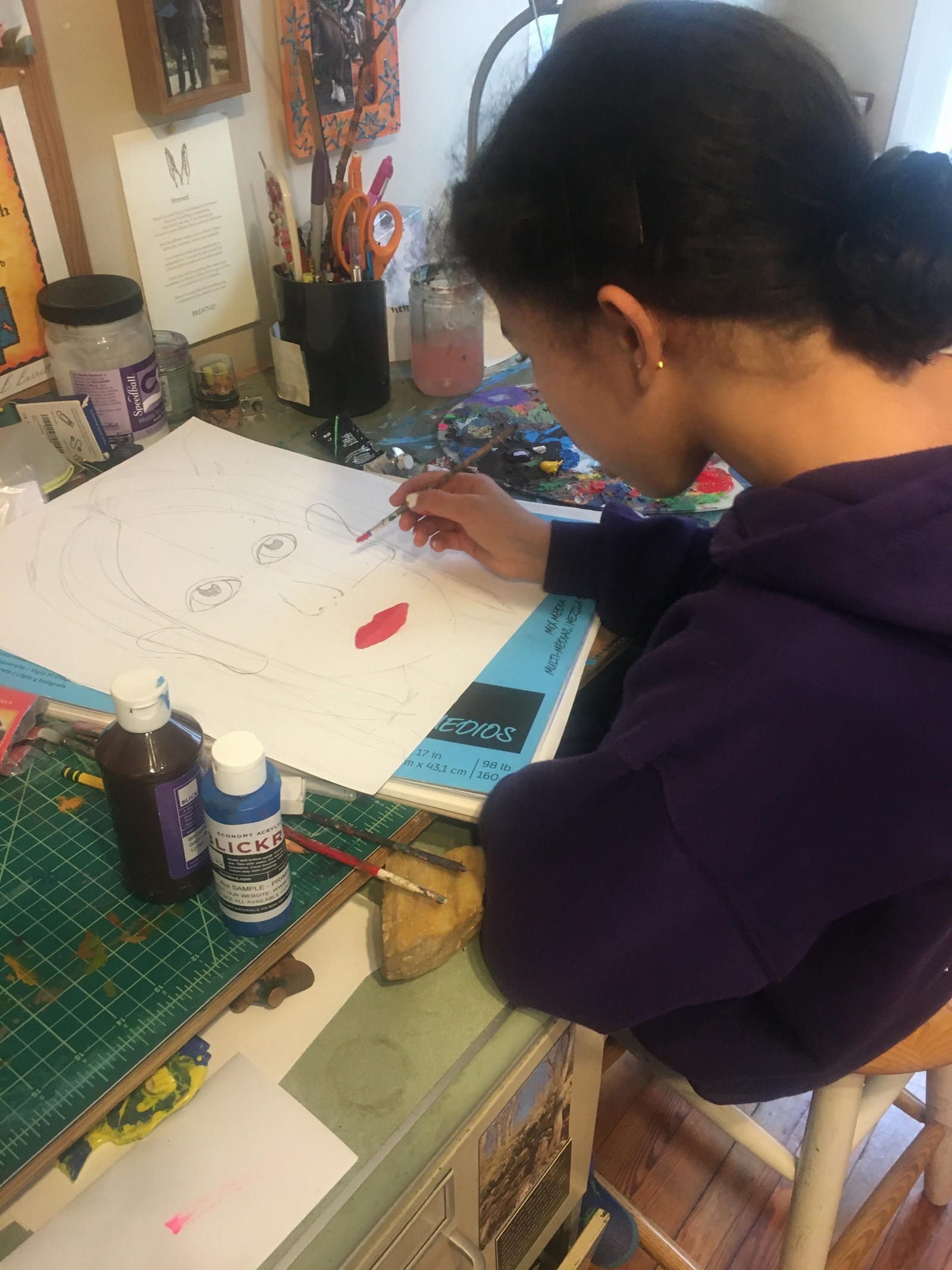 Instead of me in my studio working, it is my children. My daughter has learned to draw portraits from one of my lessons I created as an online teaching tool. After spending an afternoon in the studio on her class lessons, while I was on a conference call with my coworkers, my daughter decided to paint a portrait. My son of course wanted to join in on the action after waking up from his nap, which was in his stroller after a hike, not at school like normal on a Monday afternoon.