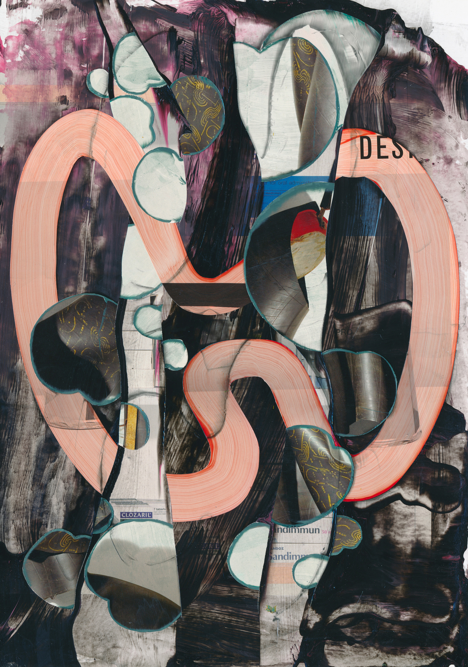But then paint is to paper as embellishment and defacement are to an ideal. I decorate and mar; I cook and spoil. By smearing paint, by stenciling and cutting biomorphic forms—by which I mean blotches, holes, and various organs, bleeding and seeping and infecting things and spaces. The rounded and bloated against the rectangular and sharp; iconophila (I’m making something delicious) versus iconoclasm (I’m befouling something beautiful).