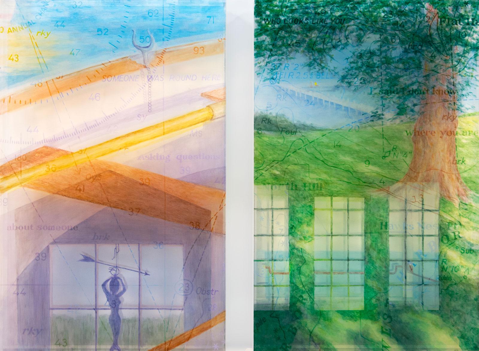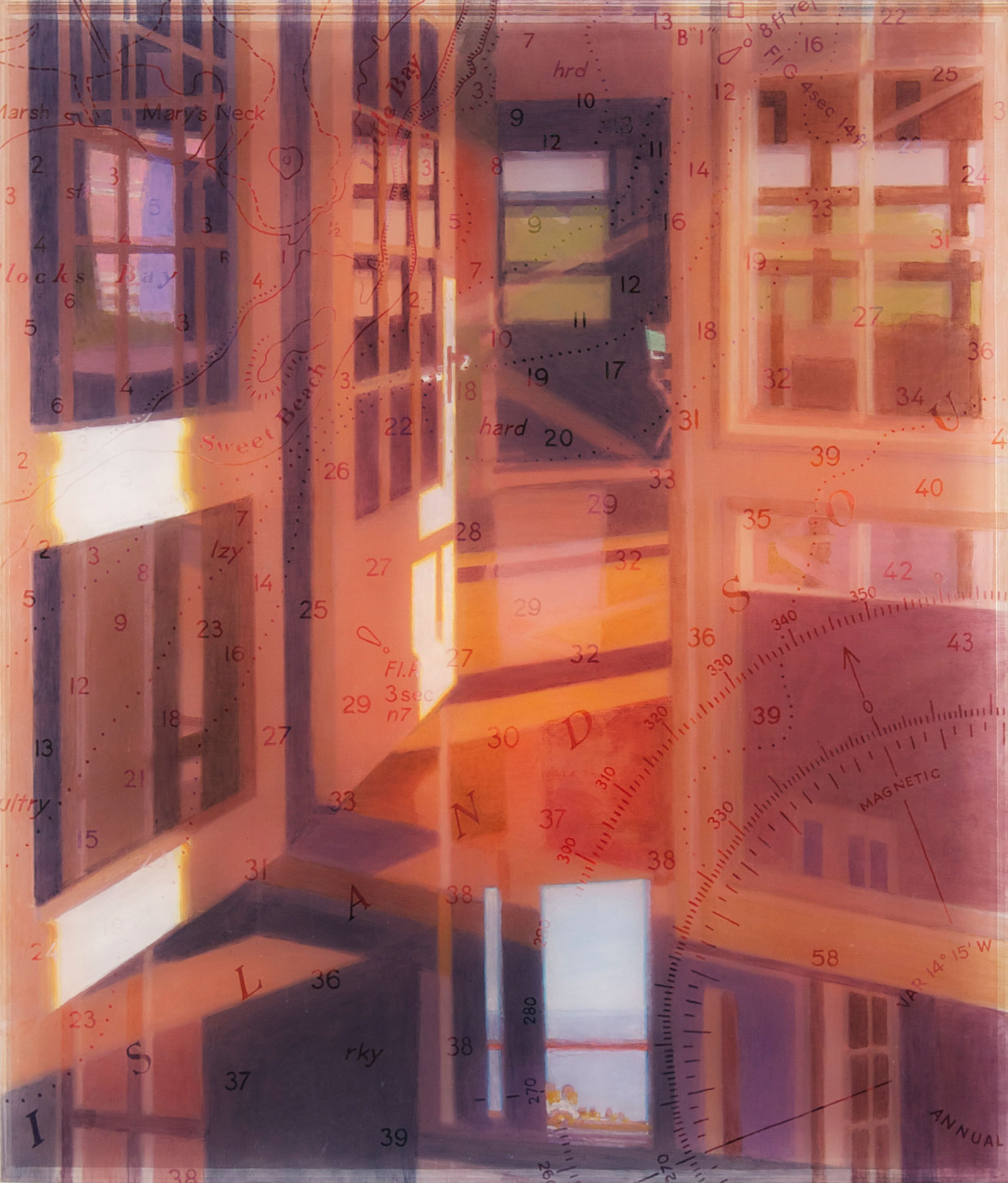 In these days of the pandemic I escape into making paintings like writing letters to the world, paintings with implied narratives created by counterpointing one image with another, with traces of maps and text in pale glazes that you can’t fully see until you draw closer.