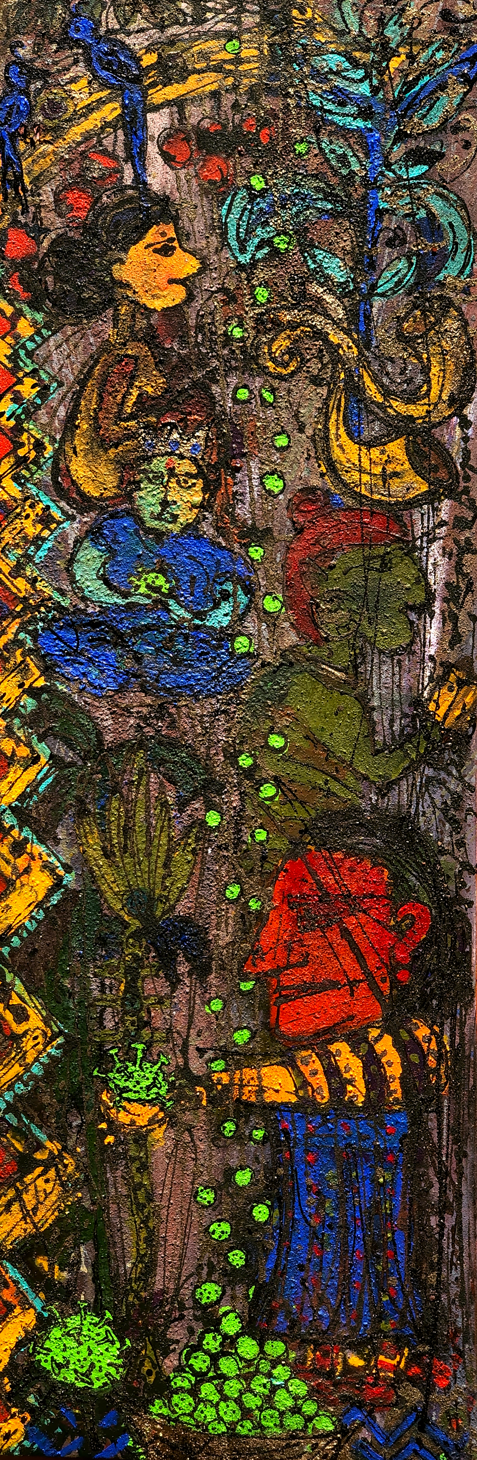 My painting, “A SLIGHT SHIFT” conceals an approaching apocalypse under veils of bright colours and neon greens; with royalty and commoners the world over refusing social distancing, hope writ large on ignorant faces…..