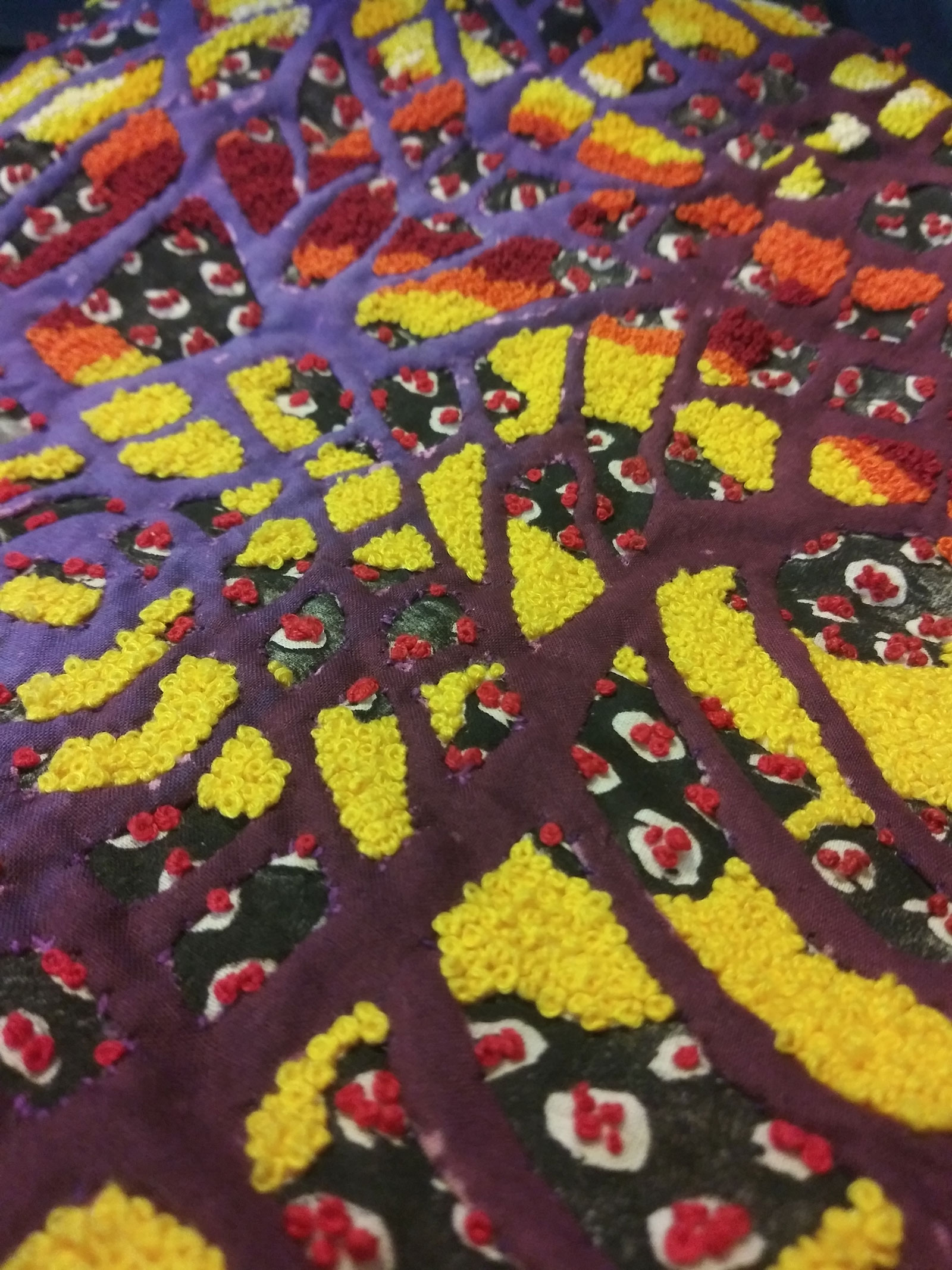 My usual studio practice was interrupted a month ago when we decided to try to sell our house and I packed up my studio. Then the world rolled to a stop and we found ourselves in stay home mode. With tons of time suddenly on my hands I scrounged through what had remained of my art supplies and found this piece that I’d started years ago and never finished. At first I aimlessly continued the reverse applique of the vein-like print on the first layer revealing the cell-like print underneath. A week at home passed as I stitched while the numbers of covid-19 cases exploded. With some clusters of red French knots inside the black printed cells, this piece finally had meaning and a purpose. I started stitching yellow French knots at the center to represent the number of CDC confirmed cases of covid-19 in the US on March 13th- the day Pennsylvania’s schools were ordered closed. Each ring of color expanding outward shows the number of cases in each subsequent day.