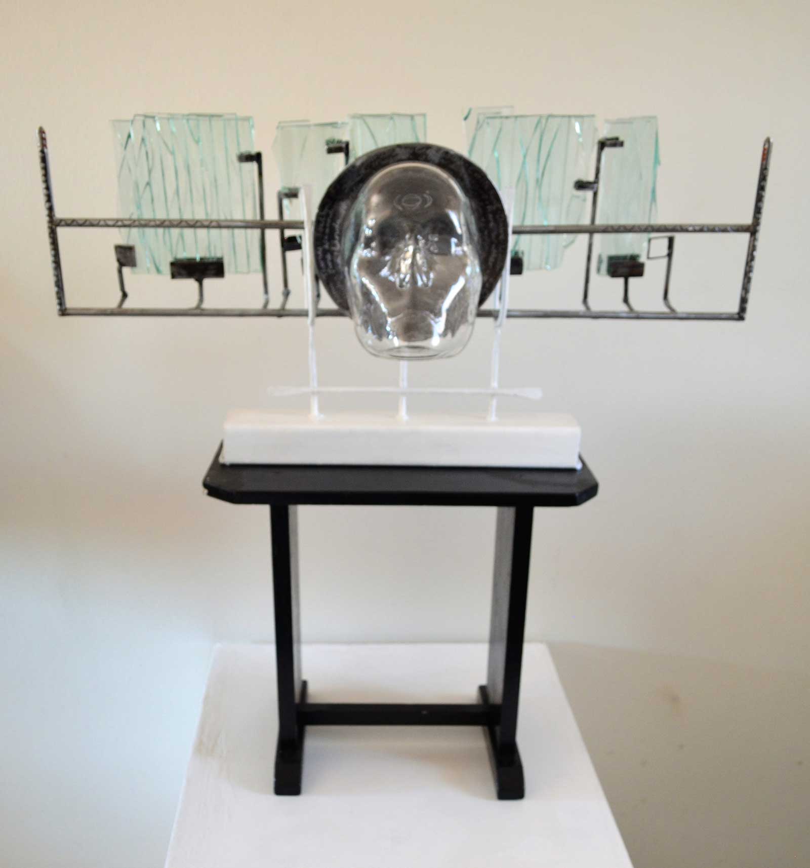 Sculpture of a mask with metal rods coming out holding three glass squares.
