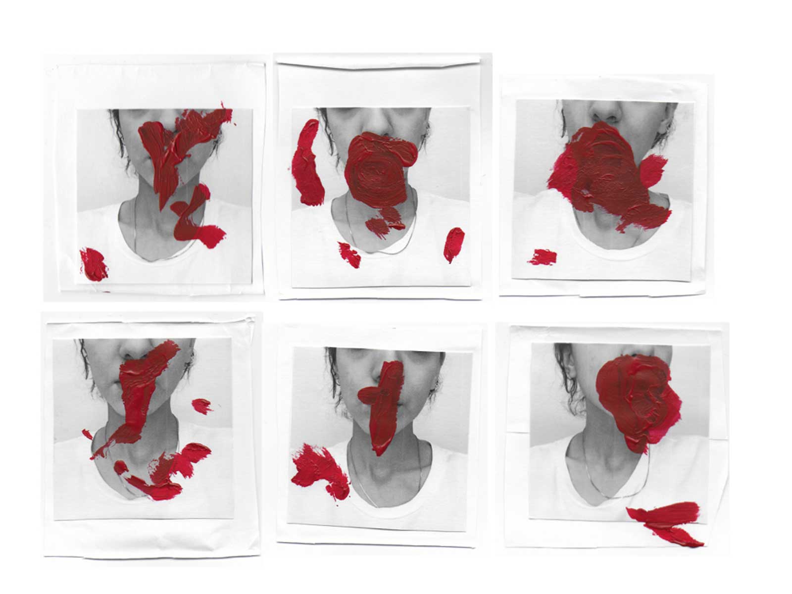 Six photos of the same person from eyes down with red painted splotches on top of them.