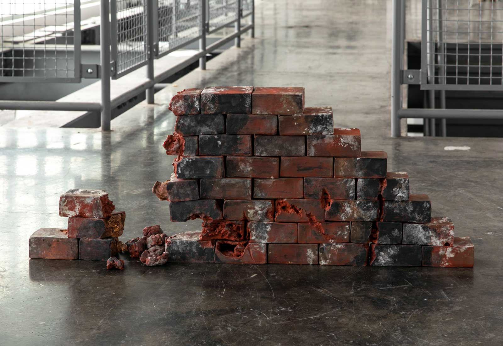 Casts of bricks in a triangular formation with a chunk "burned" out.