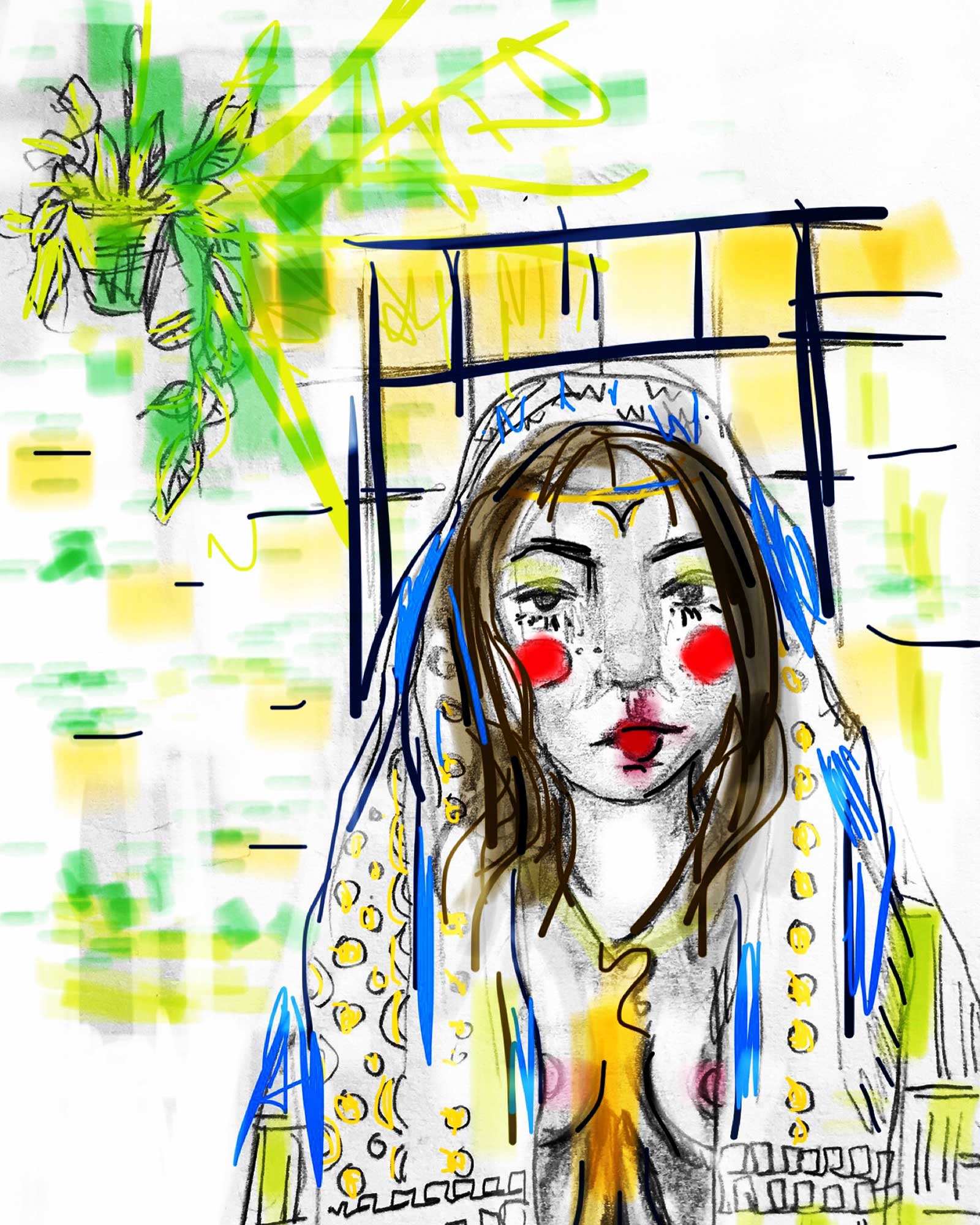Woman series depict diverse forms of sexuality in culture and spirituality; it displays subtle nudity but also vulnerability.It was created during the pandemic, displaying isolation and solitary.The setting of the place is arbitrary but yet intimate. The figure wraps herself with an elaborate blanket that shields her from the outside environment. Natural sunlight is reflected onto the covers and interior wall space. She is inviting the audience to experience harmony and serenity. It raises questions about the perspective of body but also faith. The relationship between spirituality and identity is greatly prominent.