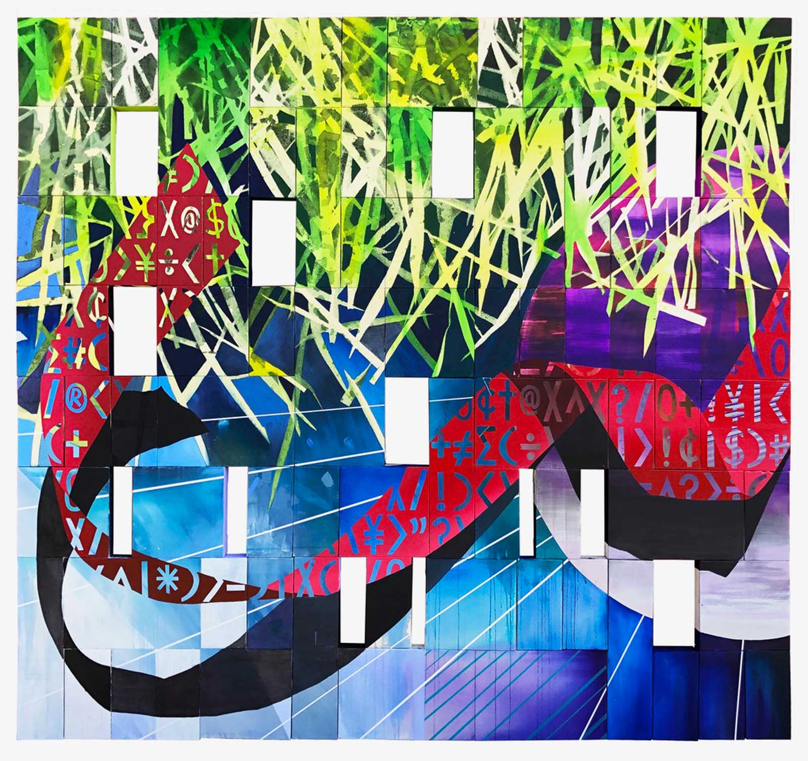 I celebrate and revel in the wreckage from the collision of new technology and cultures, and the begrudging coexistence with new systems. Through abstraction I aim to bring the viewer closer to a constant tug of war between our primal beginnings and the virtual world we approach.