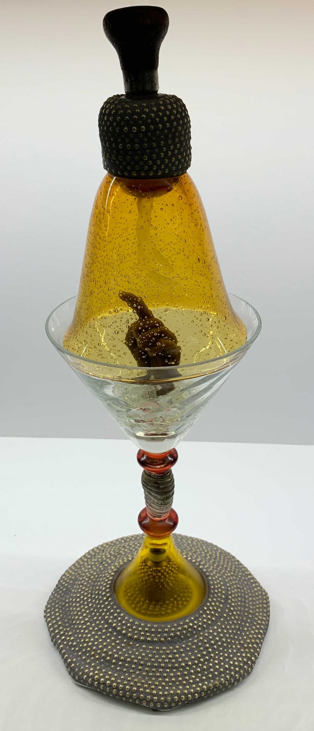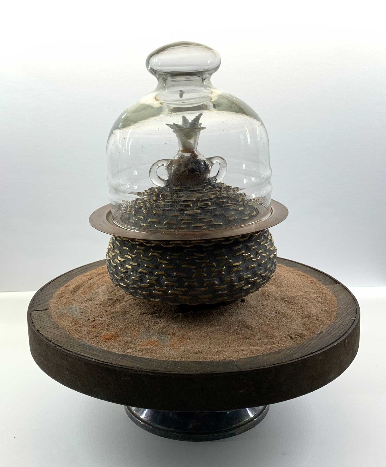 My name is Paula Mandel and I am a native Philadelphian who has been creating art for over 5 decades. I was not able to work in my studio for almost a year while I dealt with family illness. Now that I am no longer permitted to visit my Dad, I have been given the opportunity to once again create every day in my studio. I studied glass-making for several years and while I painted and created in 2-D for 30 of those years, I am now immersed in the making of glass, mixed media, found object sculpture. These two sculptures were created during the past weeks. When I work, I often have no idea where the sculpture will lead me. It became apparent to me eventually that these two were clearly impacted by the pandemic. The first is called “No Touching”, the second “Seed Safe” which reflects my worry about our ultimate food sources.