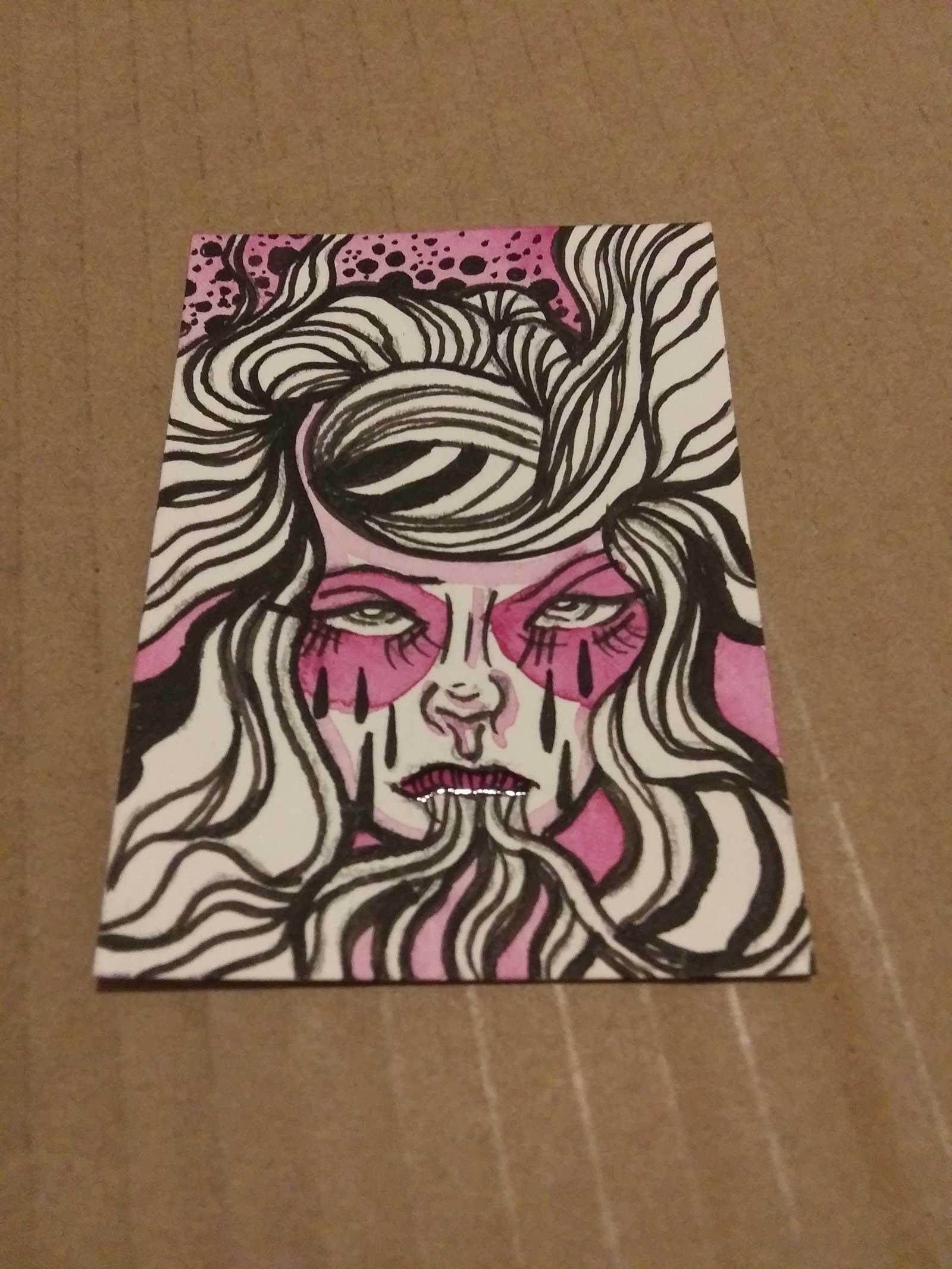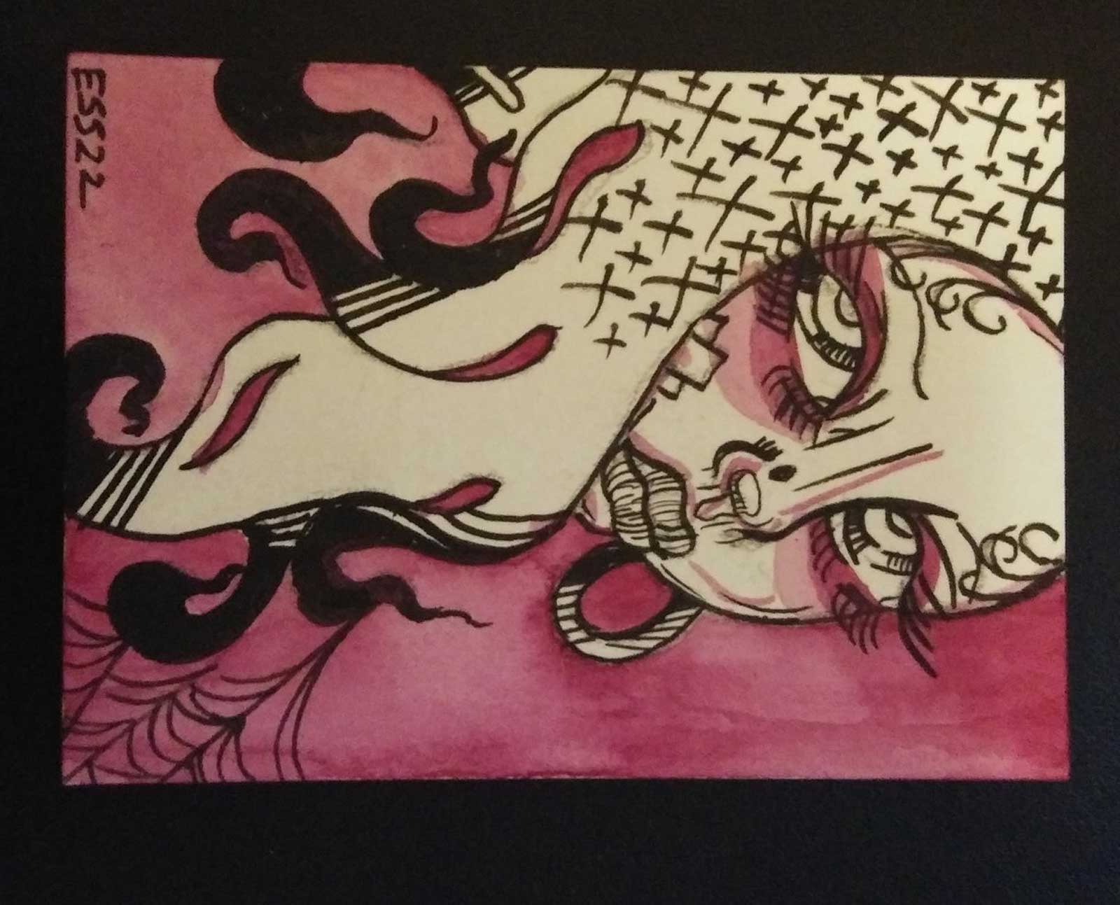 Hello. My artist name is ESS22. My paintings of female figures are inspired by tattooing, printmaking, punx, comics, and goth subcultures. During this pandemic, I’ve been forcing myself to work small and think about accessibility and limitations…As a result, I have found myself creating more art cards measuring 2.5×3.5 inches lately than my typical paintings that are 5×7-inch to 11×15-inch in size using ink on watercolor paper.