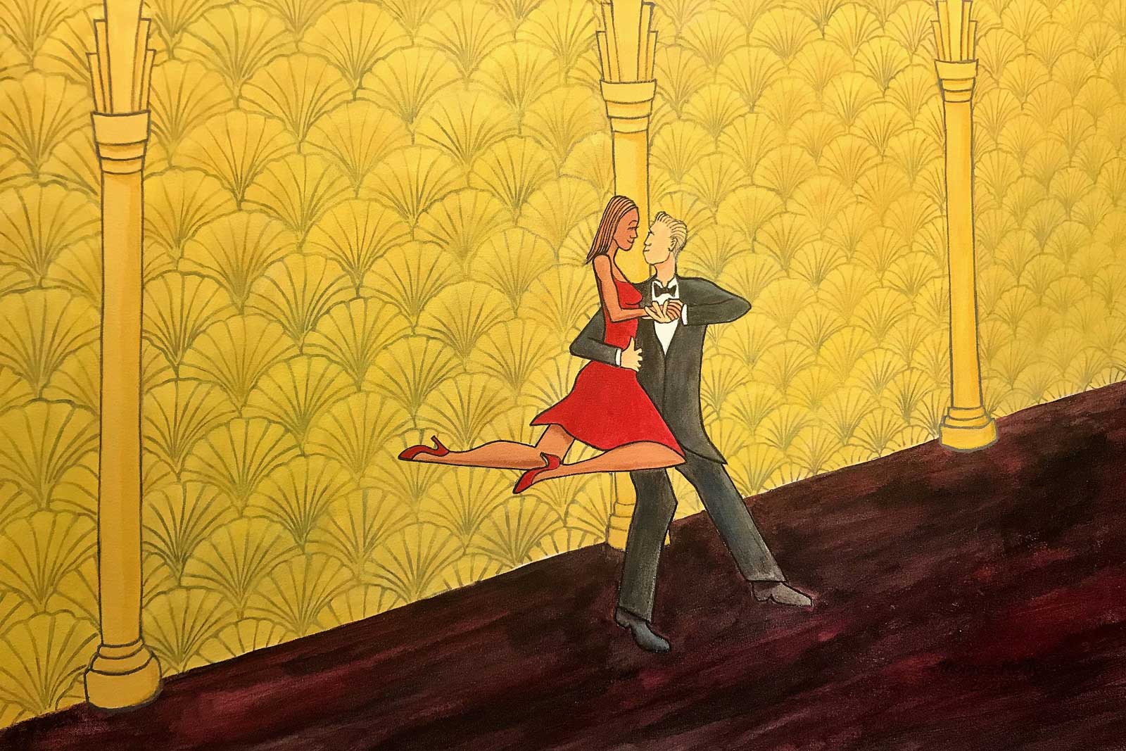 The paintings are acrylic on canvas, which lends to the way I work. The idea begins from a tiny sketch. That sketch will have the emotional feeling or gesture that first intrigued me. I encourage viewers to participate in the narrative by placing themselves inside my scenes and characters. When asked by viewers if their interpretation is the true one, I say, ‘The paintings must stand on their own.’ I don’t tell them that their stories often rival my own.