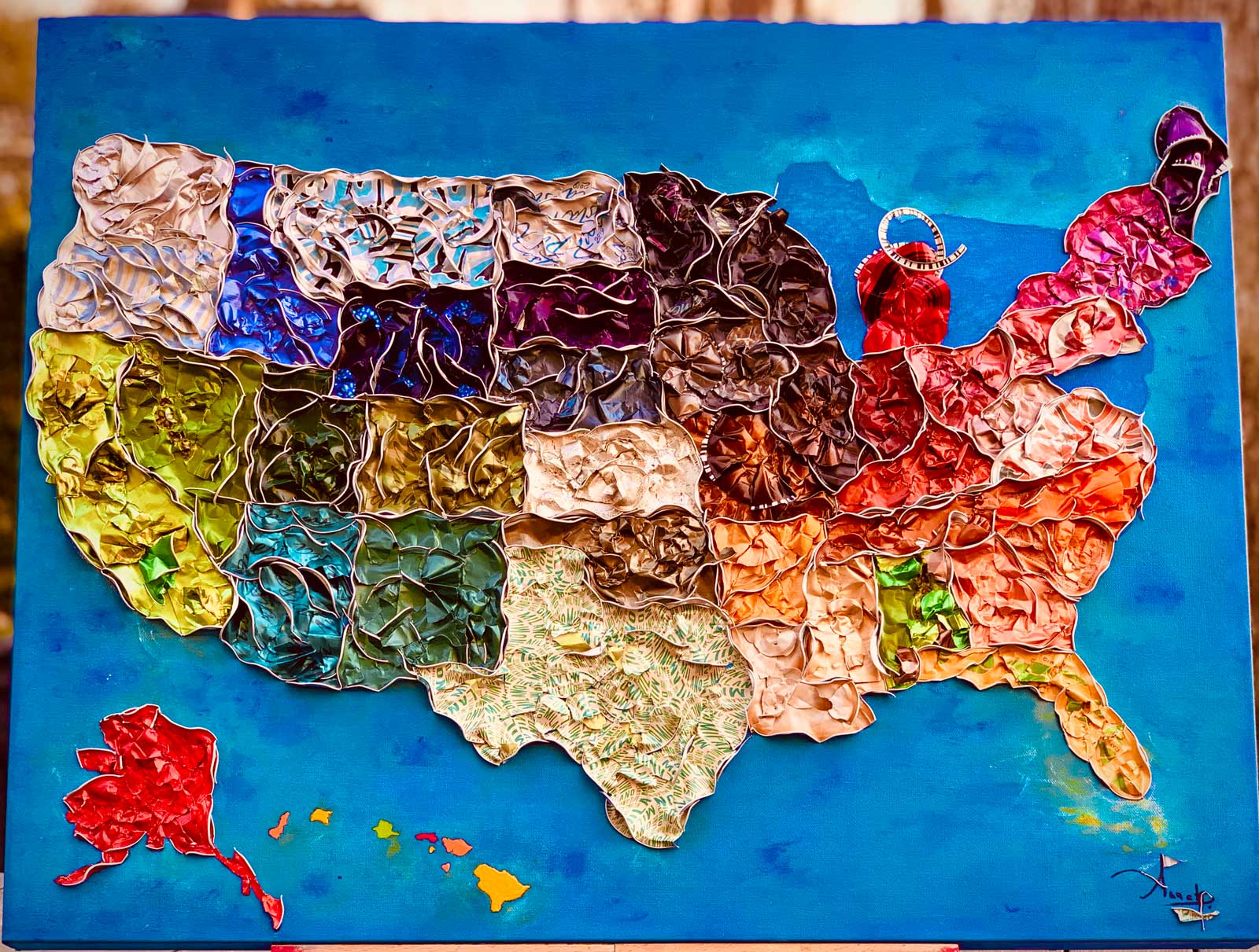 I achieved my “lovely states”, an Usa map using my favorite media support : recycled coffee capsules. I spent a lot of time around this project, using more 300 aluminum capsules including numerous hand-cuttings assemblies. I took me a lot of patience and resilience to get over it but those qualities have never made so much sense at the current time !!