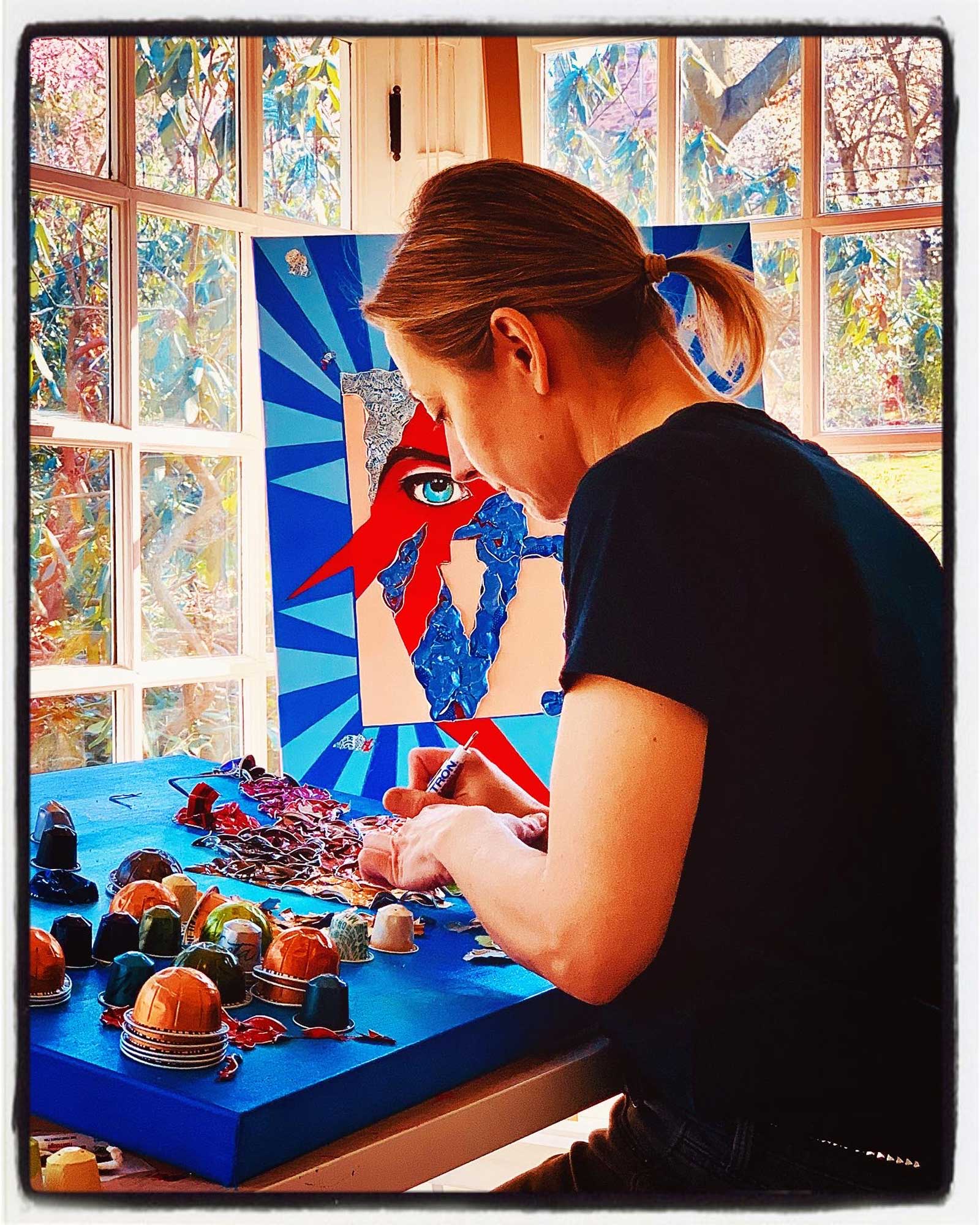 Annabel’s attention to details, craftmanship coupled with upcycling technics has led to iconoclast creations inspired by modernity and Feminism. Longtime Parisian, she finds her inspiration through pop art, fashion and travels always seeking for surprising and unexpected materials such as feathers, nail varnish, Swarovski crystals or Nespresso coffee capsules to name a few.
