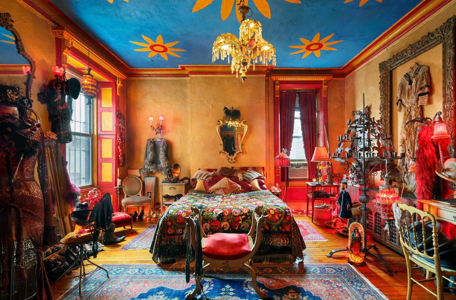 While some residents, like paralegal and Cher fanatic Mickie Esemplare, have accepted the renovation through enticing upgrades such as a private bathroom or larger space, others like cinematographer Tony Notaberardino are fighting renovations to their apartment in an effort to preserve the hotel’s history, claiming “people want to come here and touch the wall that Jack Kerouac touched, they want that authenticity.” Miller captures Notaberardino in his “sanctuary” of cheerful circus patterned walls painted by previous tenant and Australian artist Vali Myers. Among other original works of art featured on the walls of the Chelsea are Manhattan artist Joey Horatio’s dominatrix murals in the hallway of NY Nightlife icon Susanne Bartsch’s apartment and an India-inspired palette of decoupage by multi-disciplinary artist Gerald DeCock.
