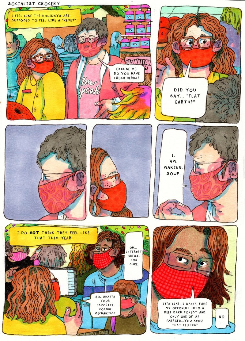 [Panel 1]: Sebastian stands in the grocery store wearing a yellow shirt, a name tag, and a red mask. They turn to look towards a customer who has approached them with a question, and who wears a red robe garment and a graphic tee that says “I’m speaking”.