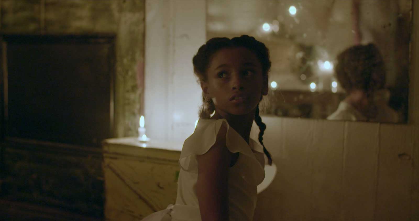 Zandashé Brown’s southern gothic psychological thriller is about a child named Ana and her mother Elise. We are introduced to the two while Elise finishes Ana’s hair in preparation for her fifth birthday party the next day. The two go through their nightly ritual with a playfulness that makes you feel they are close. As the night goes on there’s a weariness and an exhaustion in Elise- encroaching doom revealing itself. She begins to undergo a transformation, her behavior towards Ana changes, she is coarse and impatient with the playfulness of a child. The moment Ana says to her mother “You don’t smoke?…” as Elise puffs on a cigar ushers in the drastic switch. It becomes clear to Ana she has to make a difficult choice between saving her mother or protecting herself. It is her will to break the cycle, refuse to be another heir to demons. Blood Runs Down is about inheritance of trauma and ghosts. It’s about motherhood, the literal and figurative loss of self when you become a caretaker. It’s presented so beautifully, from the dim lit scenes inside their bedrooms, warm golden of candlelight, to water’s constant presence, and the chilling sounds of a violin screeching. Farrah Martin’s performance as Ana is outstanding, she acts as a guide throughout the vignettes, seamlessly woven together in the film’s mere 17 minutes.