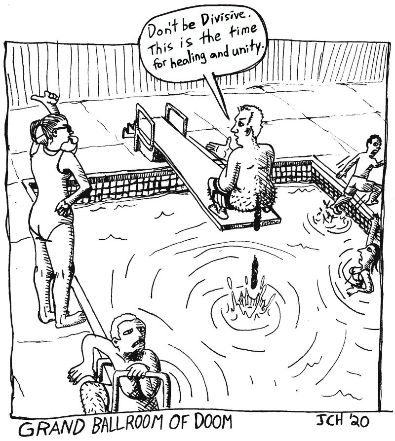 Man pooping into a pool: Don’t be divisive. This is the time for healing and unity.