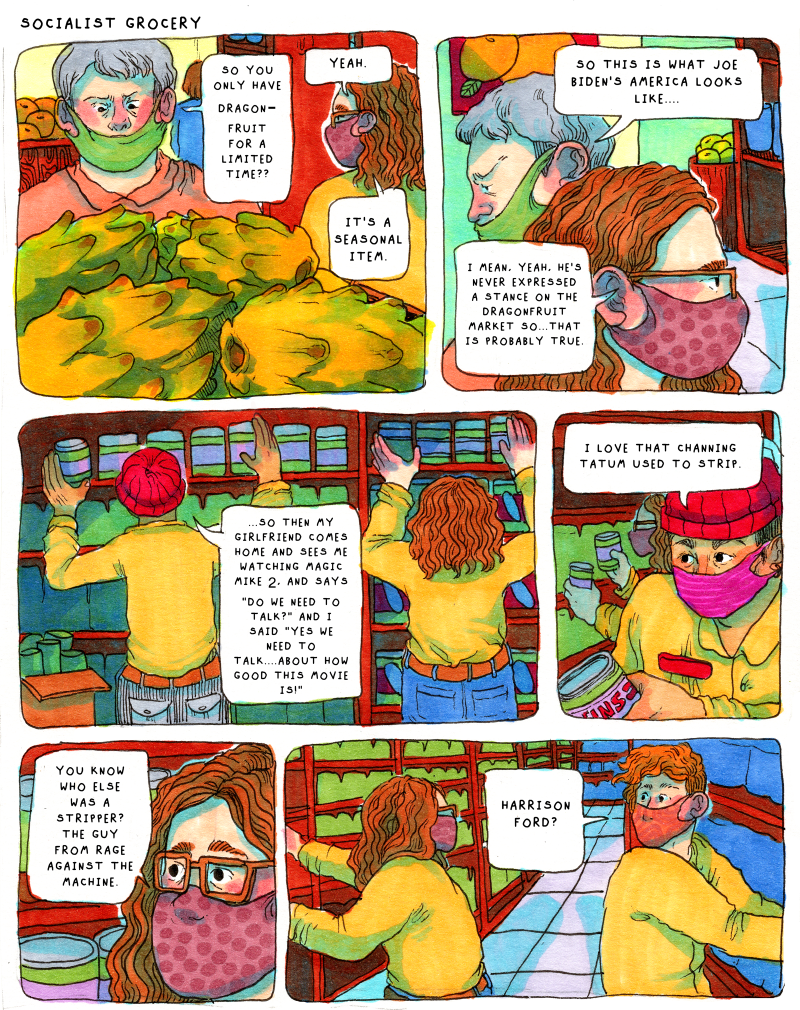 [Panel 5]: Zoom out to reveal a third co-worker, stocking the shelf parallel and opposite to the one that Sebastian and the red beanie co-worker stock. This co-worker has red hair that is swept to one side and wears an orange mask. He looks backwards towards Sebastian, who returns eye contact over his shoulder.