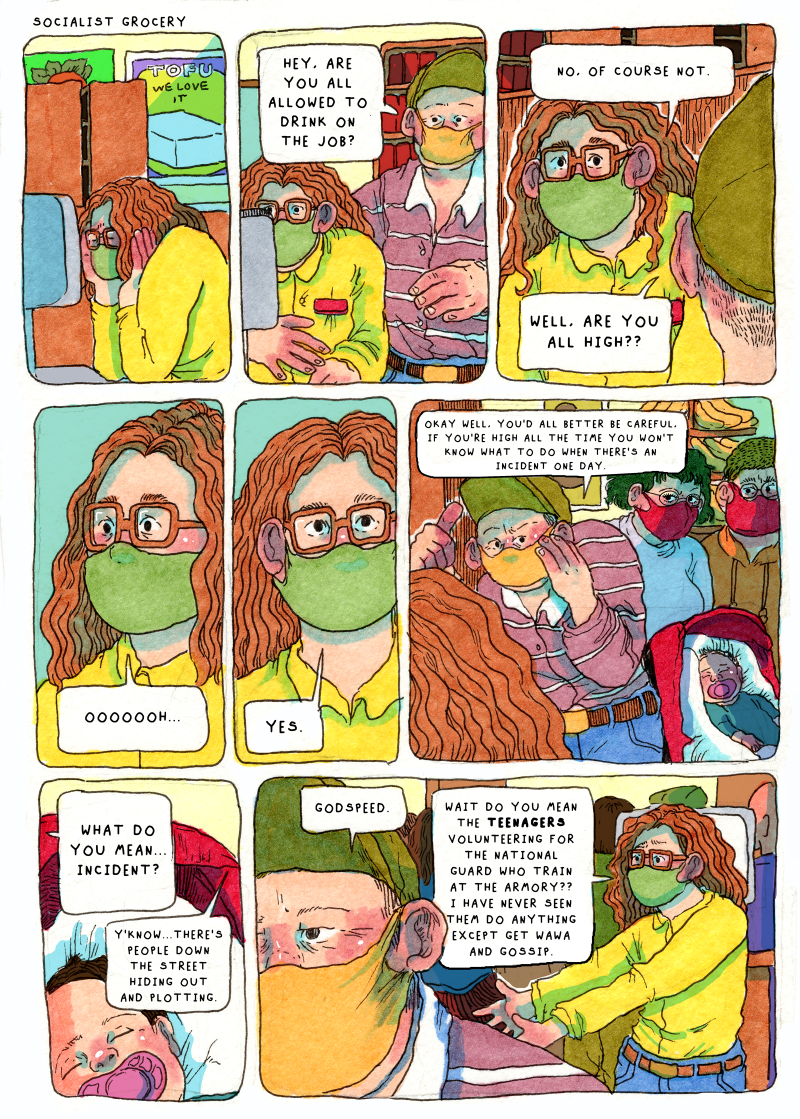 [Panel 2]: A customer– wearing a purple and white striped button-up, a yellow mask, and a green baseball cap with the brim upturned– approaches Sebastian from behind by tapping his shoulder. Sebastian looks startled as he sits upright.