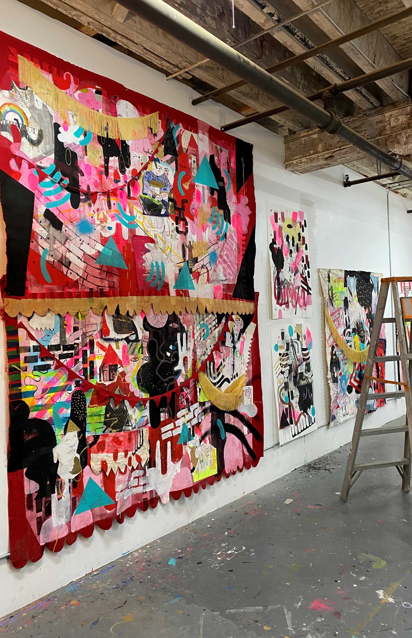JM: Most of the drawing and painting I do now is on canvas, and I layer collage on top using pieces torn from my older works made on paper and canvas. I have a hefty archive that spans twenty plus years that I pull from. Earlier on in my career, I only used paper, because it was the most immediate thing that I could get my hands on, and I really like the way paper feels. I transitioned to canvas in 2019 because I wanted to create larger works. I also wanted my works to read more as tapestries, flags, or banners. The average size I work with is about 72” x 72”, but I’ve started to work even larger than that. My canvases are hand-dyed, frayed at the edges and unstretched. I use gel medium and sewing to attach my collage components, so I don’t stretch the canvas, because that would ruin the collaging. The layering and fragmentation of collage is conceptually important because first it serves as documentation of my decision-making, the history of my hand, and my life. I think of the work as a living record of my experiences, including drawings on the works by my son, Piero. Secondly, it relates to this idea of what it’s like to be a mixed racial/ethnic person in this complicated country and using my story as an entry point. Doing this work with canvas has slowed my process down a lot, where with paper I could just go at it and it was immediate, now I have to wait for things to dry, and take my time.