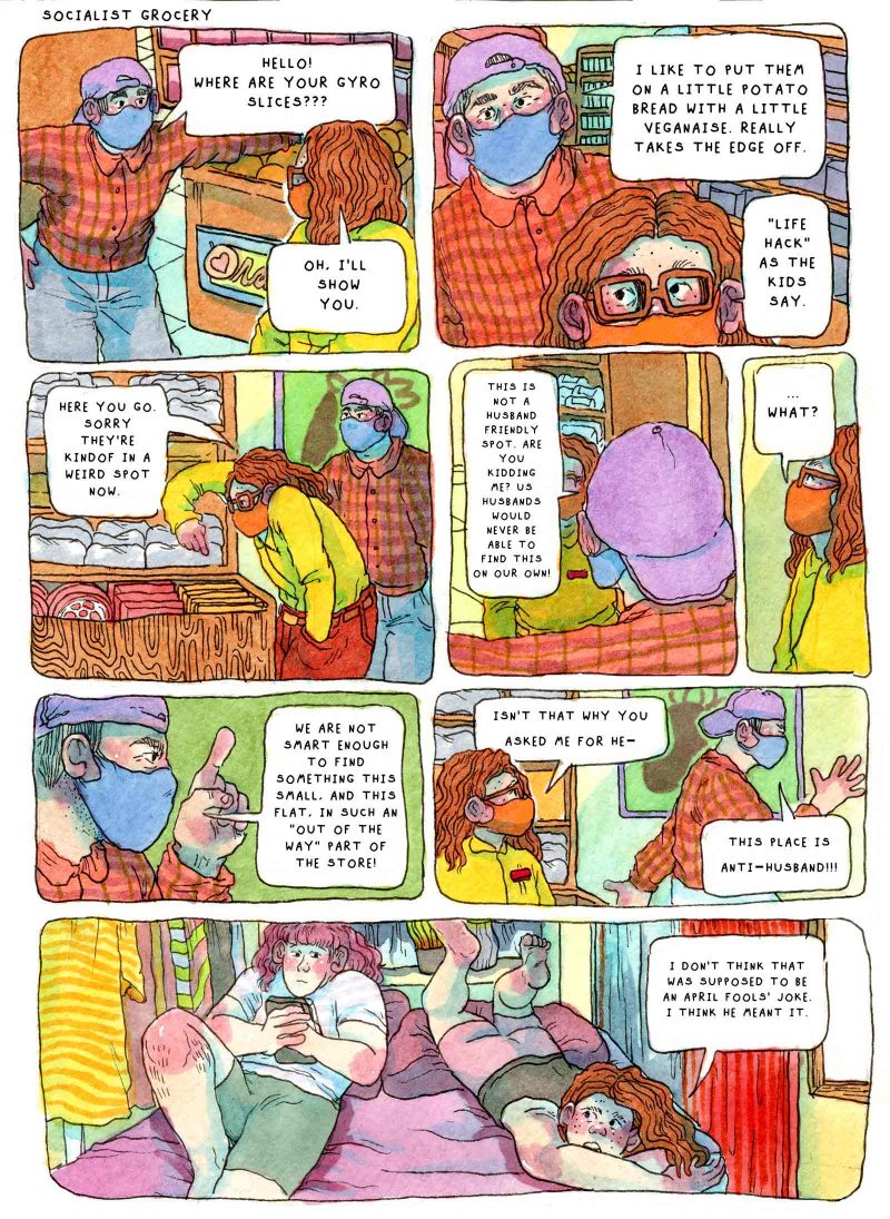 [Panel 1]: A customer, who wears a red flannel button down, a purple backwards cap, a blue face mask, and blue jeans, approaches Sebastian frantically with a question. His left arm leans on a food stand. Sebastian– wearing his signature work uniform of a yellow button-up, this time accompanied by an orange face mask and orange thick-framed glasses– is turned to face the customer, his profile visible as he responds to him.