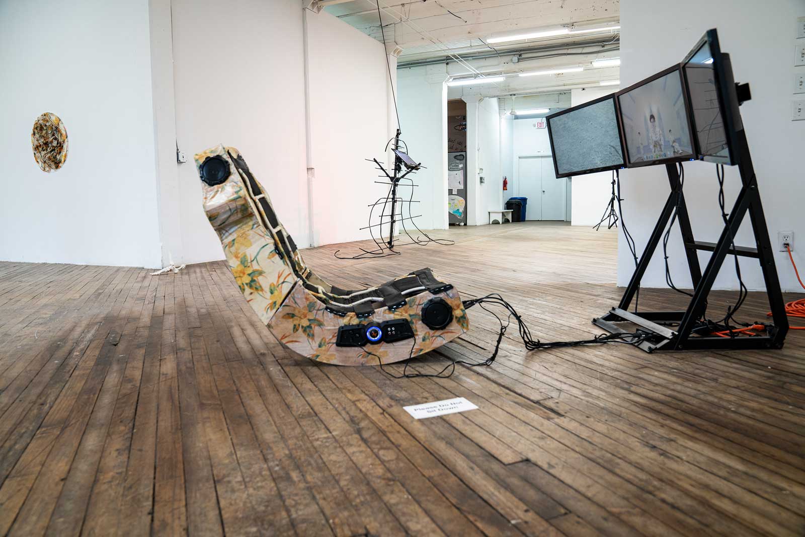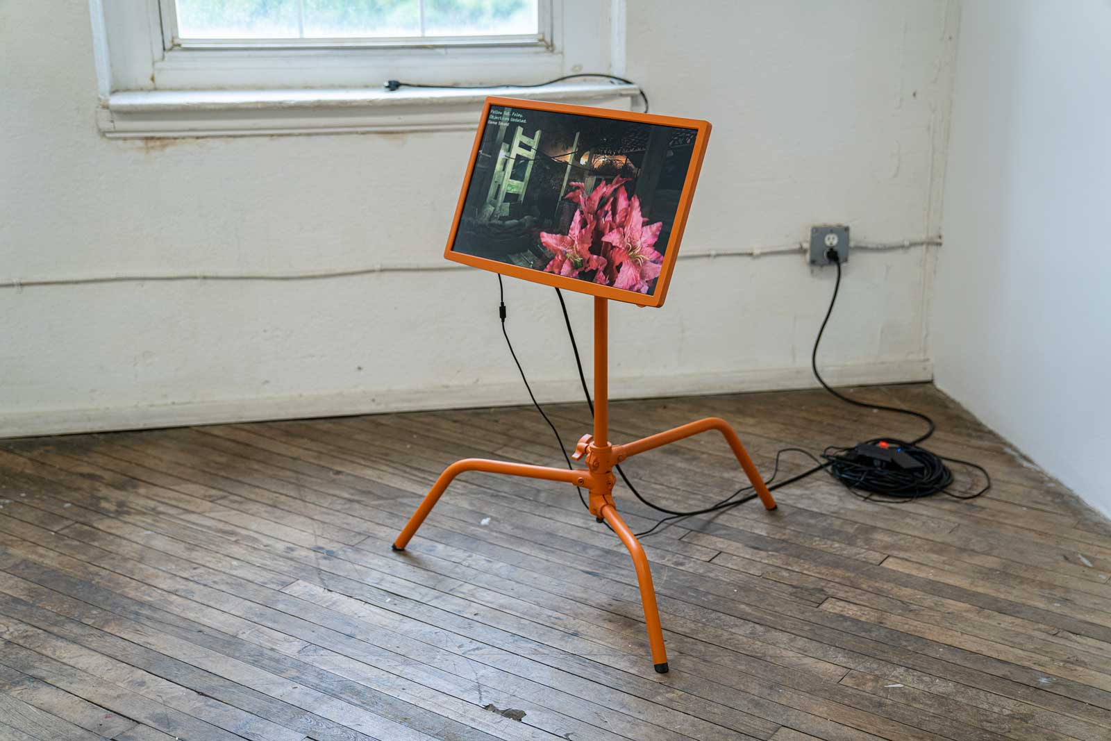 The gravitational center of the show, Hazen’s “Call of the Lily_1” (2019), arranges a set of three monitors in front of a beaten up, floor-rocking gamer’s chair. The triple-split-screen video weaves together an overwhelming amount of found and created material, but largely centers on a relationship between footage of U.S. military activity, and various simulations of the same thing. At a glance you might see a modified version of the video game franchise, Call of Duty, alongside scenes of airstrike explosions or reels of muscular, combat-ready personnel wielding fake guns and VR headsets.