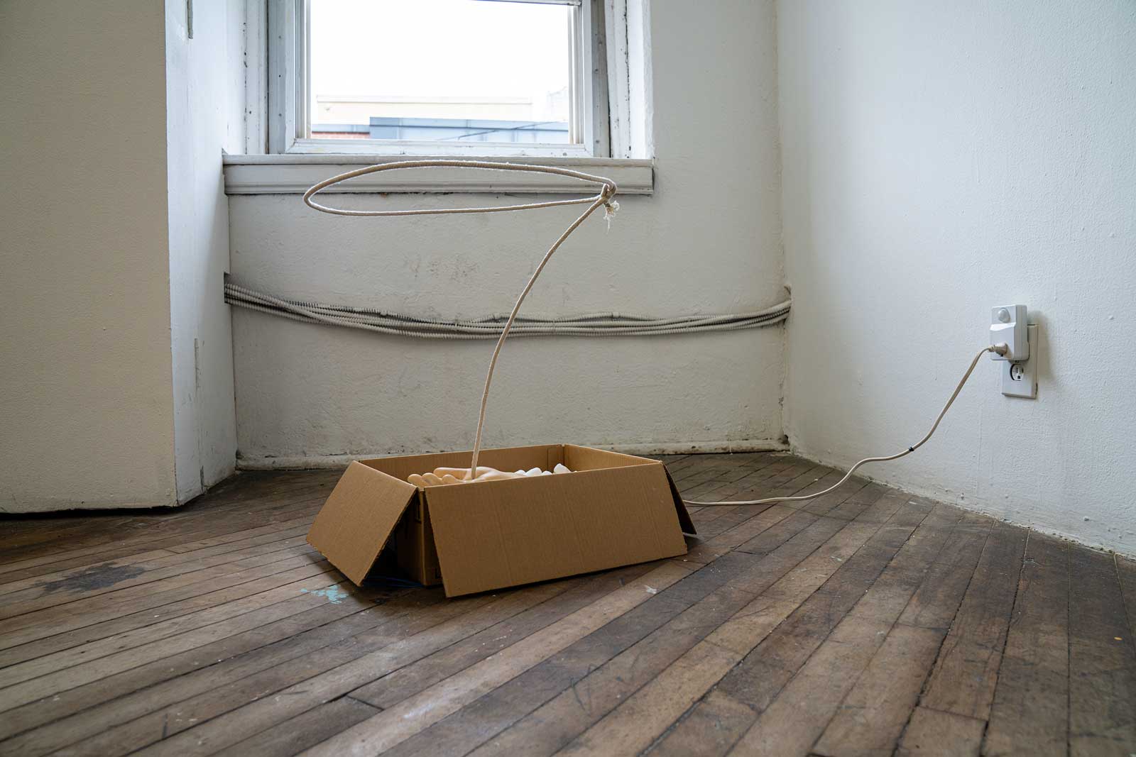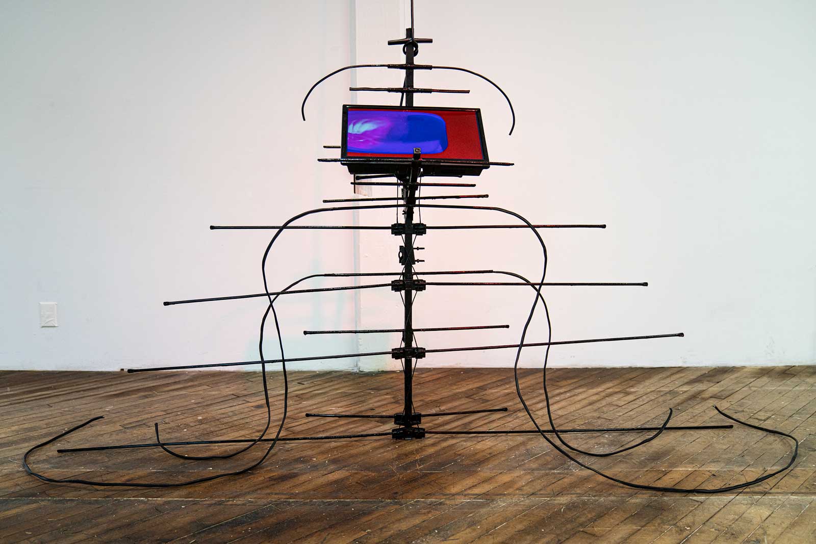 Similar changes of time and action can be seen in the work of Zach Hill and Shay Arick. Hill’s subtly shifting video monitor in “Screaming,” digitally recasts Munch’s The Scream utilizing a sunset background from the night of the 2020 U.S. presidential election, centering the protracted sense of anxiety and fear surrounding those results. Hill’s “Spiraling Jewel Girl,” takes this prolonged sense of dread even further, by mounting a screen of lights on top of a found and distorted rooftop TV antenna. The resulting object is something more organic––demonic, even––as if out of a horror movie.
