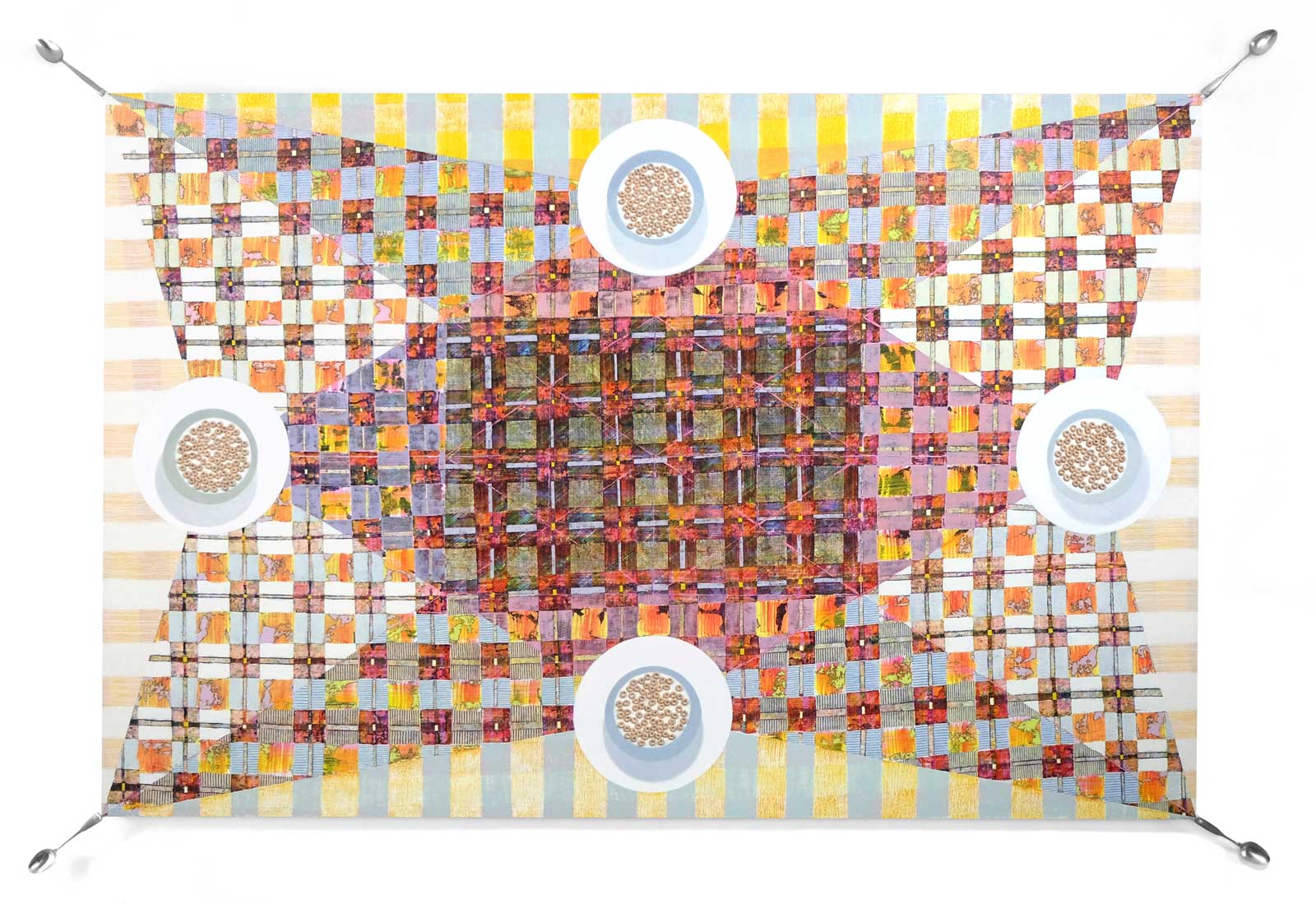Cookout consists of works that depict food stuff: bowls of cereal, pre-prepared bread for sandwiches, bagels, spaghetti, picnic blankets. In his curatorial statement, Horn reminisces how he and his family would prepare meals with ritualistic enthusiasm as a way to express love to each other. Although sentimental in motivation, Horn approaches the subject of food with an acute focus on design and creates esoteric diagrams of the moments before eating.