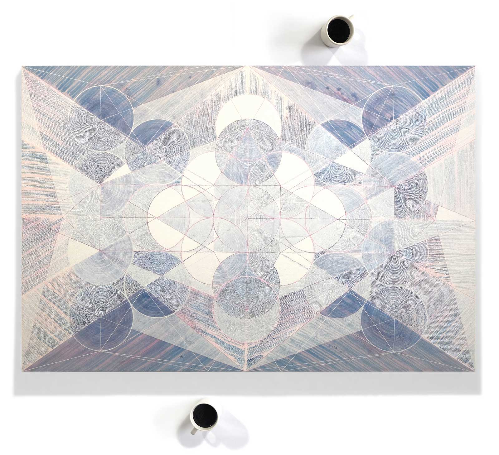Most of the paintings in Cookout are depicted from an aerial point of view. Horn’s compositions feature grids, geometric patterning and a minimalist usage of squares and circles that highlight the painting subject — a piece of toast, halves of a bagel with cream cheese. The palettes are light and cool, drawing attention to the slight hue shifts between background and foreground or across tesselating surfaces.