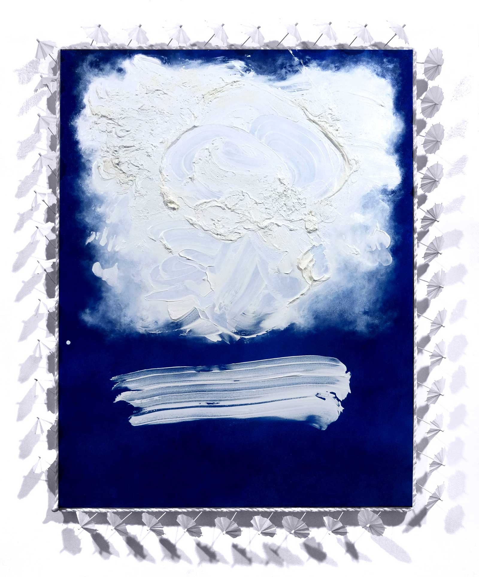 “Night Cap,” in addition to its 43 cocktail umbrellas, also features a high chroma blue background and two gestures of textured white paint. The umbrellas are all placed at an angle and their positions facilitate a swirling aura around the painting. The otherwise expressionist qualities of the composition are turned into a enchanting abstraction of a drink.