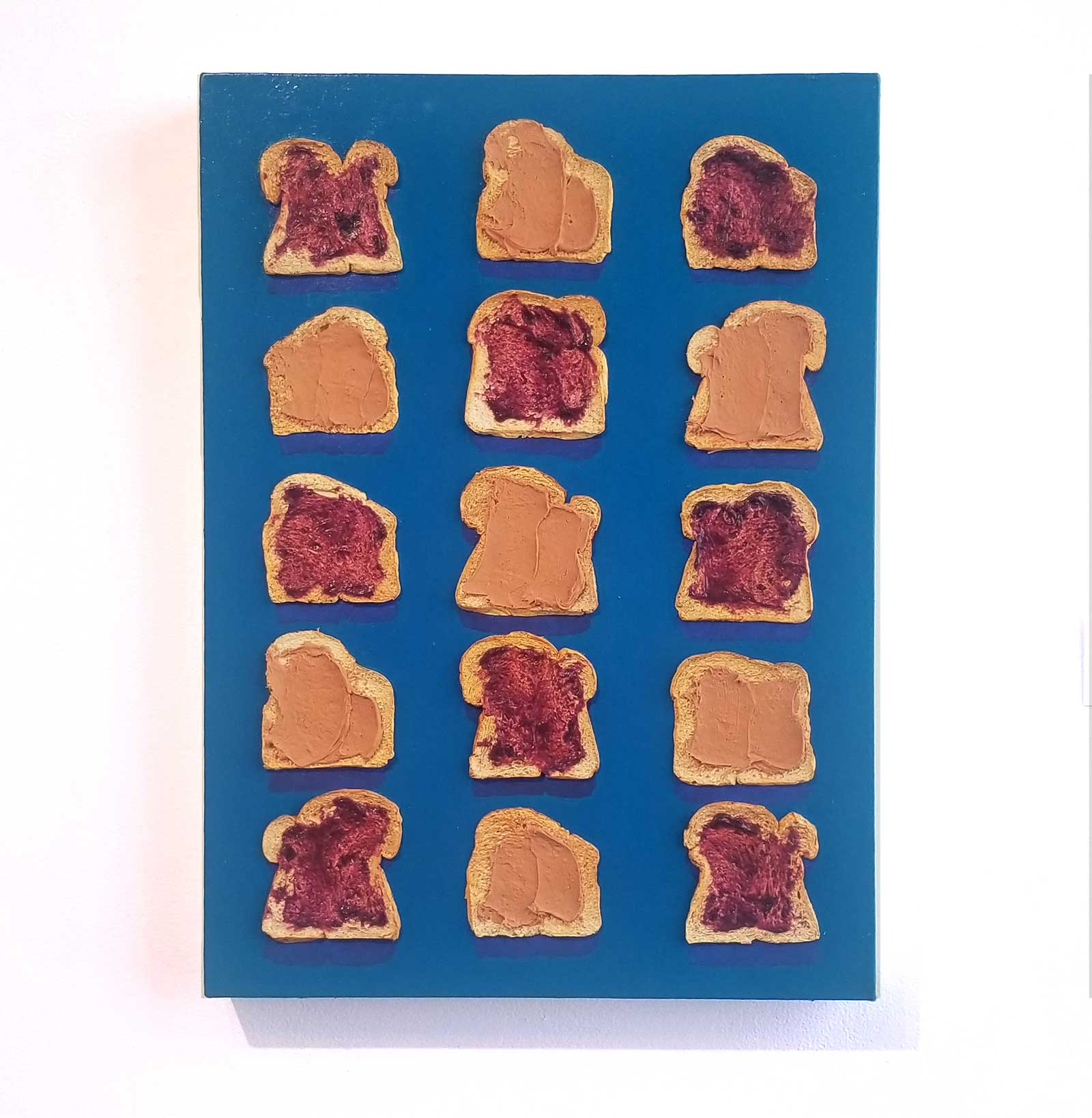 With the exception of a wall-sized graphite drawing of a picnic blanket, the other 11 works in Cookout feature some sort of dimensional element. The three paintings in the “Peanut Butter and Jelly” series, for example, all depict slices of bread that are alternately slathered in either a peanut butter or jelly-like material. The bread both lays on the surface of the painting and emerges from it, not quite separated from the canvas. How these replications are forged exactly is a mystery but, the bread does have a beautiful crumb structure and nice browning on the edges.