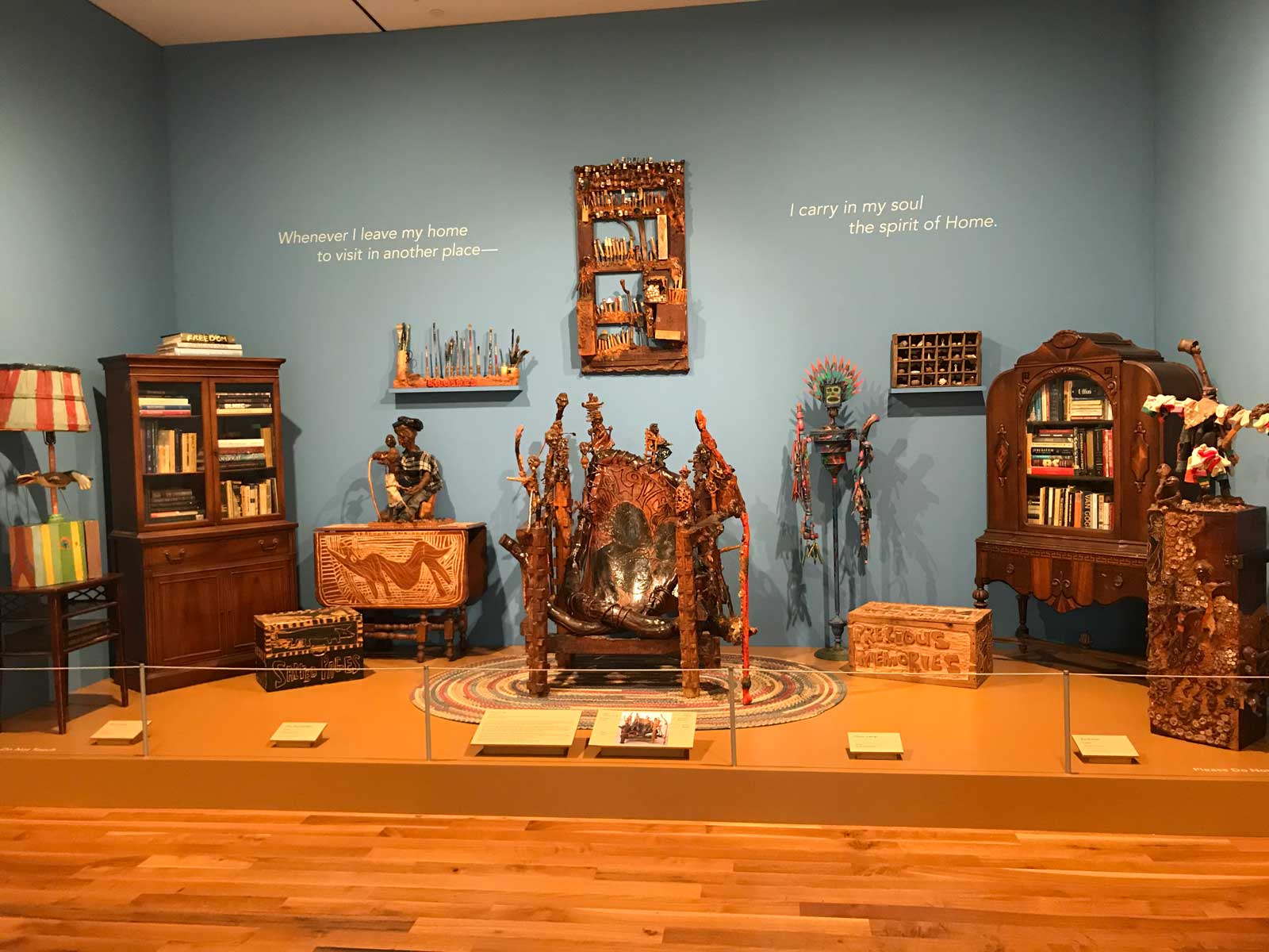 Raggin’ On starts with large photographs of Robinson and her real-life house on Sunbury Road. The unexpected sight of her exterior front door installed in the gallery space will surprise some visitors. On this carved wood with various brown hued faces and large, expressive hands squeezed between bright, energetic shapes outlined in black. Perhaps by making the outside match the inside, she was warmly inviting family and friends into a joyous, creative environment. The museum curation echoes this sentiment— every work delivers a sense of magical enchantment or a thirst to know the true story behind the work. Around the corner of the door lies a recreated living room featuring homemade objects and collected beauty. She crafted unique holders for her paintbrushes. Eccentric sculptures either operate figuratively or melt like candle wax drippings. The library offers a glimpse into Robinson’s influences; books on Jacob Lawrence, the Gees Bend quilters, Lois Mailou Jones, Vincent Van Gogh, advertising, art history, and design. The door and living room set the tone for the expansive show— that Robinson was extremely resourceful with her surfaces, tools, materials, and references.