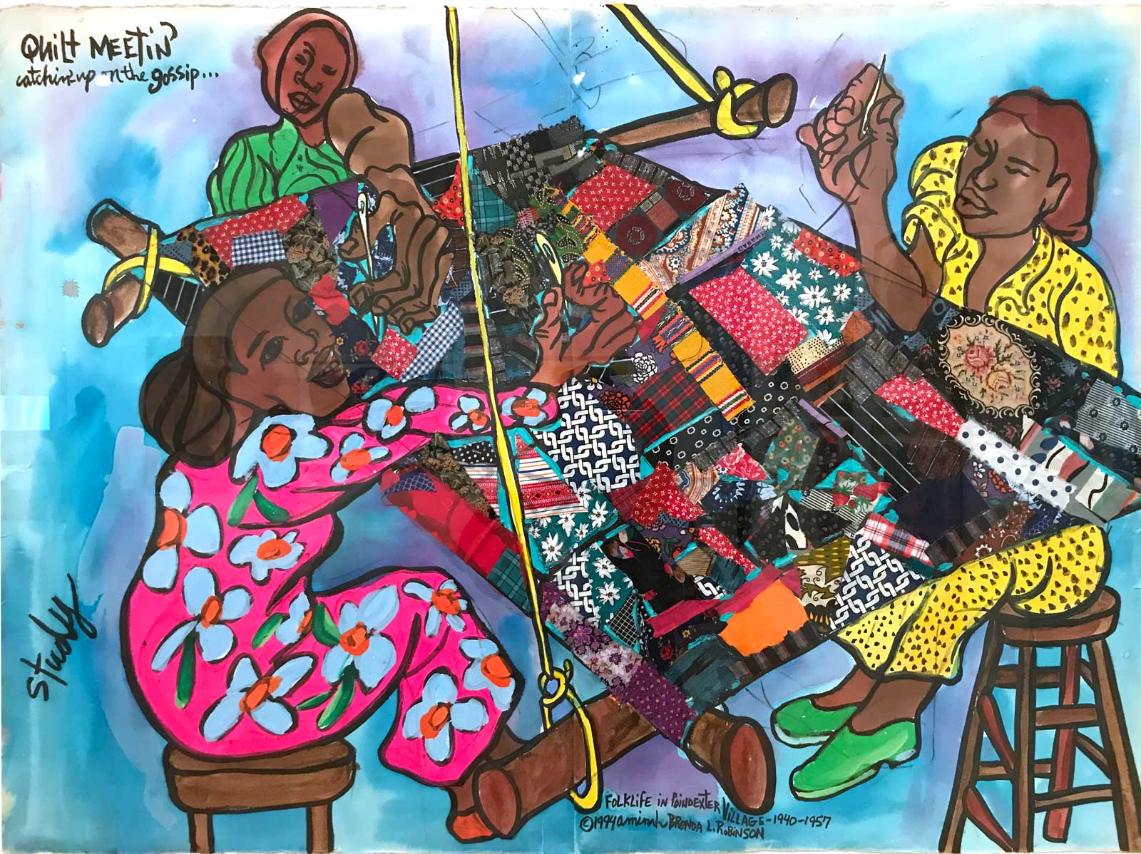 “Quilt Meetin’ (Catchin’ Up On The Gossip),” a rag painting on paper, has three women stitching on different sides of a huge quilt, their active hands as big as their heads. Their clothes are painted on— a pink dress with white flowers, a yellow dress with red polka dots, and a green blouse— but the quilt has various fabrics adhered. Yellow strings hold the frame up for them. In this particular work, Robinson is sharing that these gathered women are not only communal artists, they are brought together by a duty to keep sacred traditions flowing. It is a talking point and a bonding ritual.
